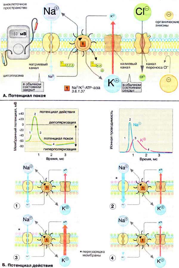 Мембраны, в том чикле плазматические, в принципе непроницаемы для заряженных частиц. Правда, в мембране имеется Na+/K+-АТФ-аза (Nа+/К+-АТР-аза), осуществляющая активный перенос ионов Na+ из клетки в обмен на ионы К+. Этот транспорт энергозависим и сопряжен с гидролизом АТФ (АТР). За счет работы «Nа+,К+-насоса» поддерживается неравновесное распределение ионов Na+ и К+ между клеткой и окружающей средой. Поскольку расщепление одной молекулы АТФ обеспечивает перенос трех ионов Na+ (из клетки) и двух ионов К+ (в клетку), этот транспорт электрогенен, т. е. цитоплазма клетки заряжена отрицательно по отношению к внеклеточному пространству.