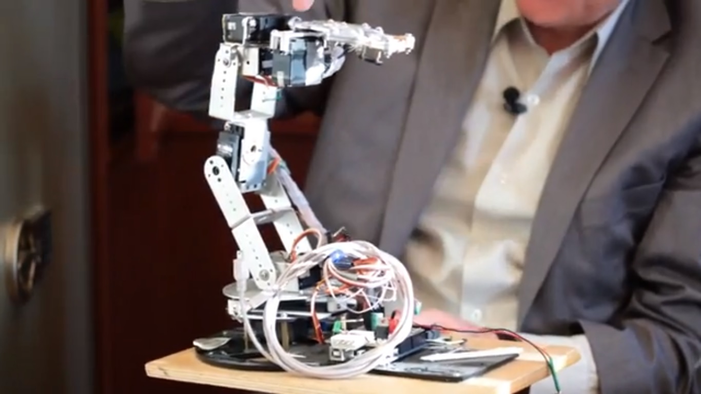 А.К.: «Я сейчас имею нейрокибернетику реальных устройств, когда мозг будет достаточно плотно коммуницировать с вычислительной техникой. И это настоящая нейрокибернетика, потому что должны появиться обратные связи. Например, мы хотим управлять манипулятором. У нас есть макет манипулятора с шестью моторами. Мы силой мысли или нашим волевым усилием должны как-то распоряжаться этими шестью моторами, чтобы он вытянул свою стрелу, что-то взял клешнями и передвинул в другое место.