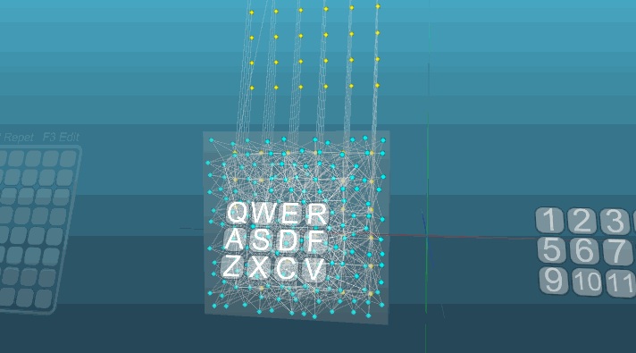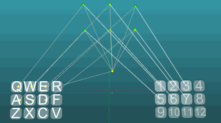 У нас имеется рецепторное поле из 12 рецепторов (Q, W, E, R…V), все рецепторы являются одинаковыми, находятся в равных условиях. И каждый рецептор имеет представительство (рецепторный нейрон) в группе взаимосвязанных клеток расположенных в плоскости, подобно тому, как это организованно во фрагменте коры обрабатывающей сигналы от органов чувств. Это будет область первичной обработки и поэтому нейроэлементы этой области имеют очень высокую пластичность (P = 1).