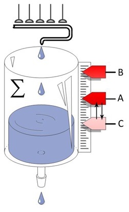 Рассмотрим схему суммации в нейроэлементах которая представляет некий сосуд наполняемый медиатором, из которого происходит непрерывная трата этого медиатора. Если уровень медиатора в сосуде достигает планки «А» то происходит активация нейроэлемента. Если уровень активирующего воздействия успевает достигнуть планки «В», то произойдет не просто активация нейроэлемента, а в дополнение произойдет снижение основного порога активации «А» до уровня «С», эти изменения будут нести временный характер.
