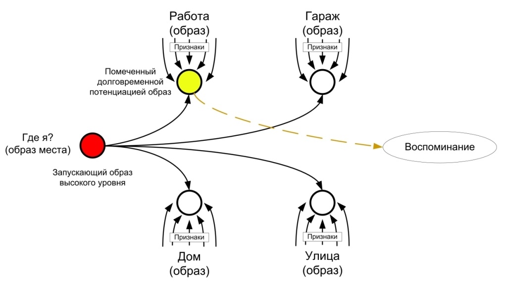 Представим, что существуют группы нейронов отвечающих за образы мест, к примеру, образы: «работа», «дом», «улица» и т.д. Тогда находясь на рабочем месте, мы можем получать множество зрительных, слуховых, тактильных образов и признаков указывающих на то, где мы находимся. Это приводит к тому, что нейроны связанные с образом места будут помечены долговременной потенциацией. Теперь на определённом временном интервале, пока действует долговременная потенциация, достаточно небольшого стимула от корневого образа места, чтобы нейроны соответствующего образа активировались.