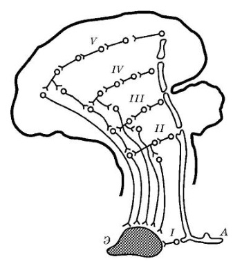 В какой форме хранится информация в нервной системе? Если говорить о нервной системе моллюска, то все ограниченно настройками синапсов в цепочках нейронов уже имеющихся рефлексов. Но если обратится к нервной системе млекопитающих, то она обладает инструментом позволяющим формировать рефлексы, которые небыли заданны у животного от рождения. Рефлексы в нервной системе представлены виде рефлекторных дуг или цепочек нейронов, по которым последовательно передается нервное возбуждение. Можно представить, что цепочки нейронов формируют целые схемы путей, по которым распространяется возбуждение, одни пути очень крупные подобно магистралям другие более мелкие подробно тропинкам и все это подвластно некоторым перестройкам и изменениям.