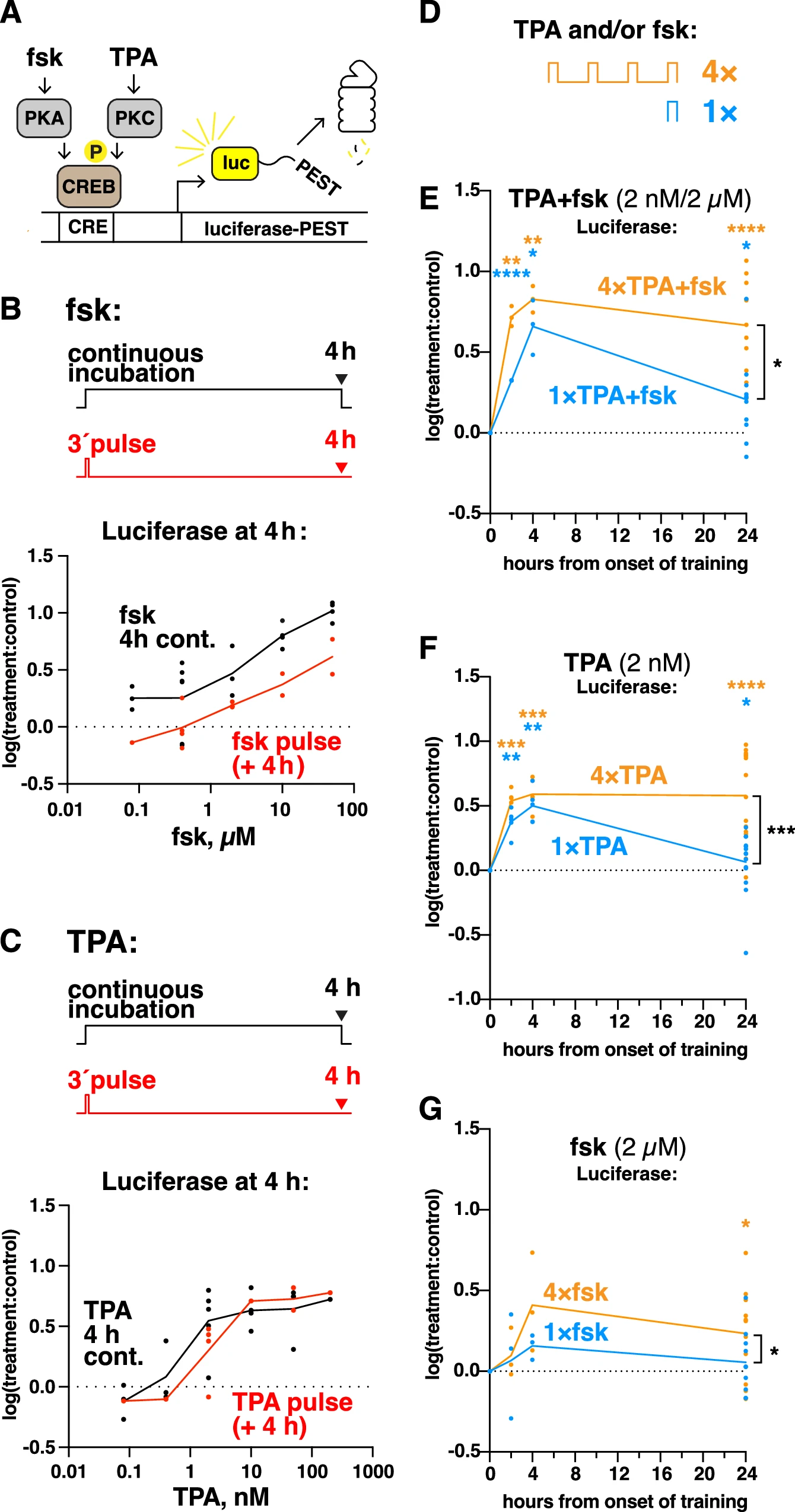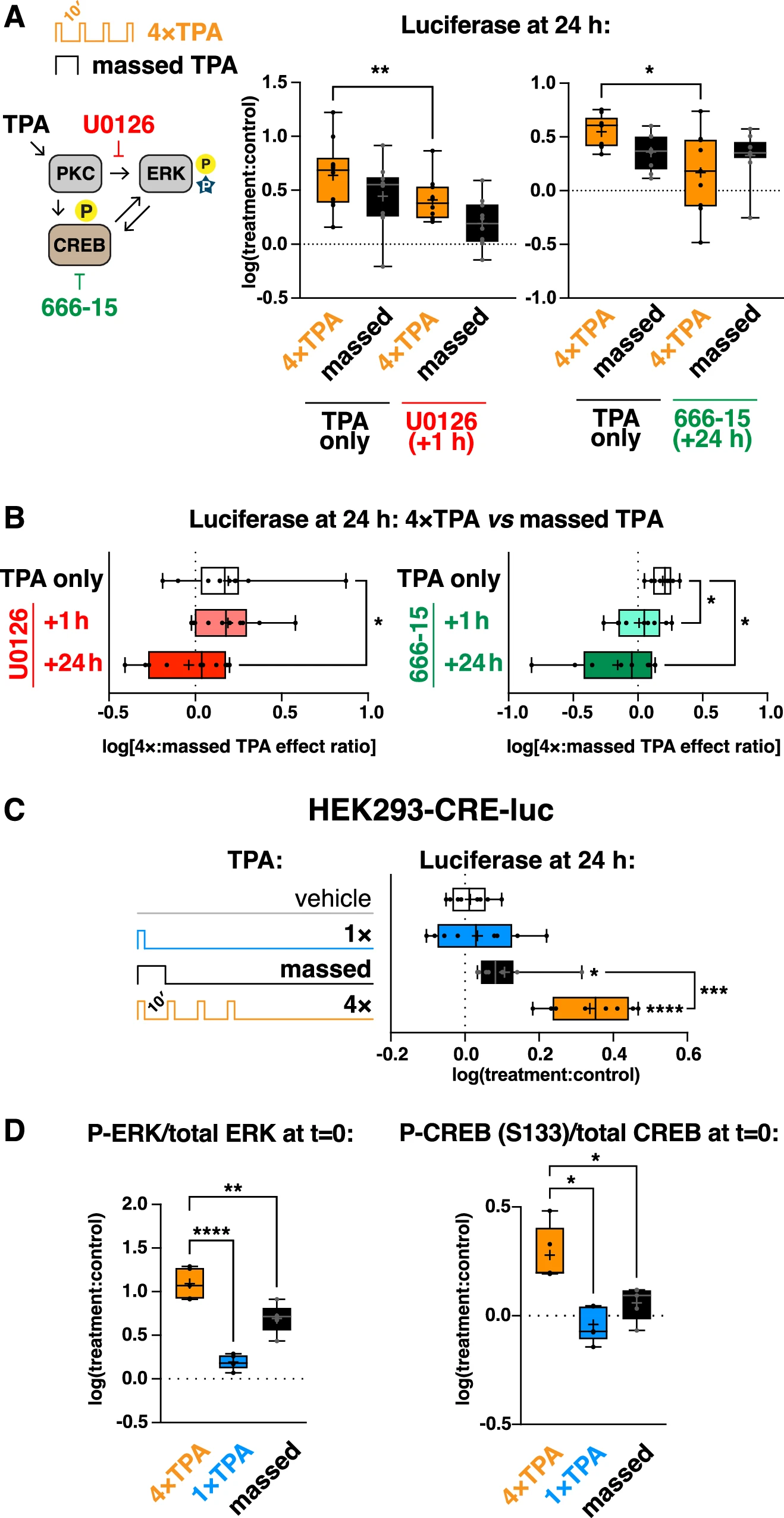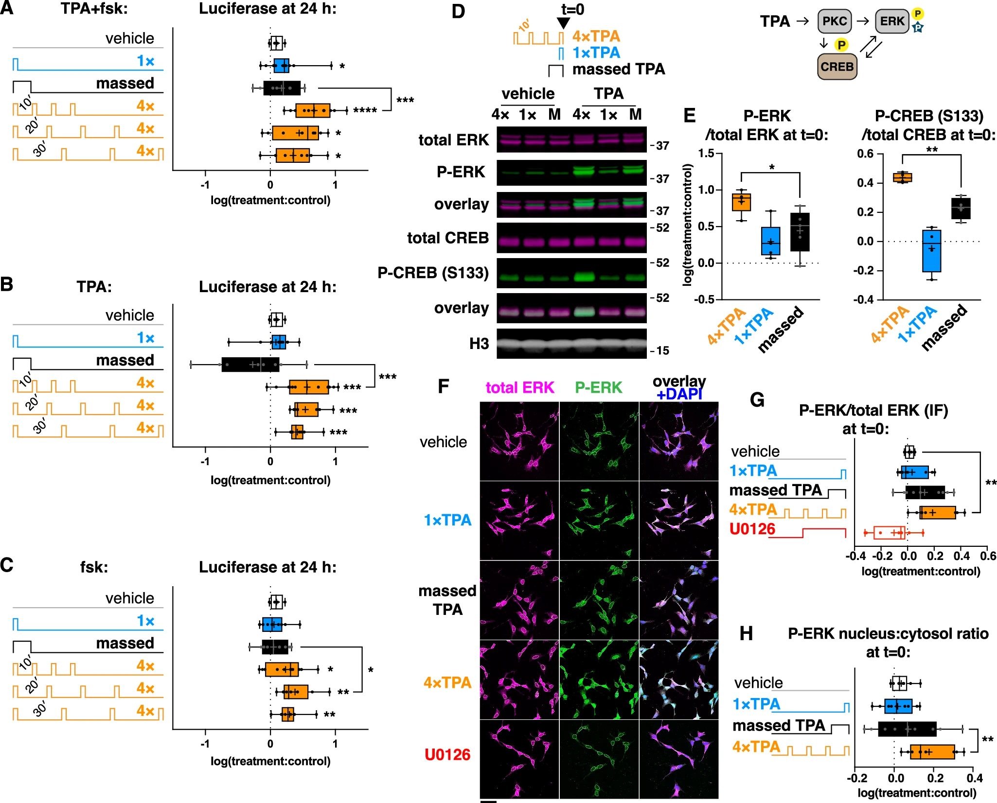 Чтобы дополнительно охарактеризовать эффект распределения в клетках CRE-luc, ученые изучили влияние различных протоколов обработки TPA (1×, 4× и массированный) на фосфорилирование CREB и ERK, важного узла клеточной сигнализации, который действует выше CREB и интегрирует временные события в функцию формирования долговременной памяти, включая сигналы от PKA и PKC. Клетки были лизированы сразу после окончания протокола обучения. Вестерн-блот показал устойчивое фосфорилирование ERK после всех обработок и CREB после 4× и массированной обработки (3D, 3E).