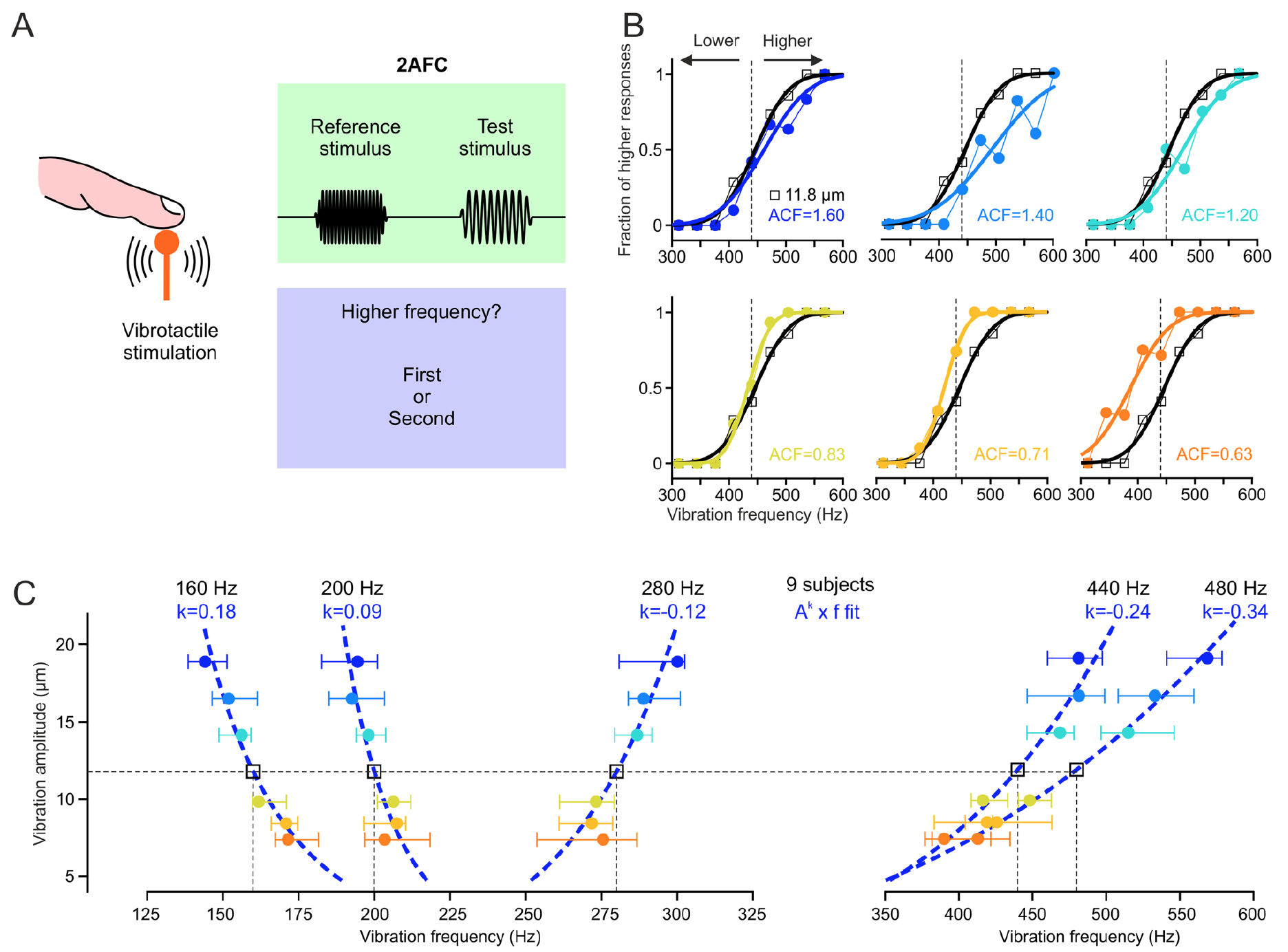 Подбор коэффициента сдвига частоты как функции коэффициента изменения амплитуды (ACF от amplitude change factor) позволил определить, что вибротактильный тон выражается как произведение частоты вибрации (?) и степенной функции амплитуды вибрации (A) (1С). Кривая Ak x ?, где k = 0.32, представляет все пары амплитуда / частота, которые вызывают такое же восприятие тона, как и вибрация 450 Гц при изначальной амплитуде в 5.6 мкм (черный квадрат на 1C).