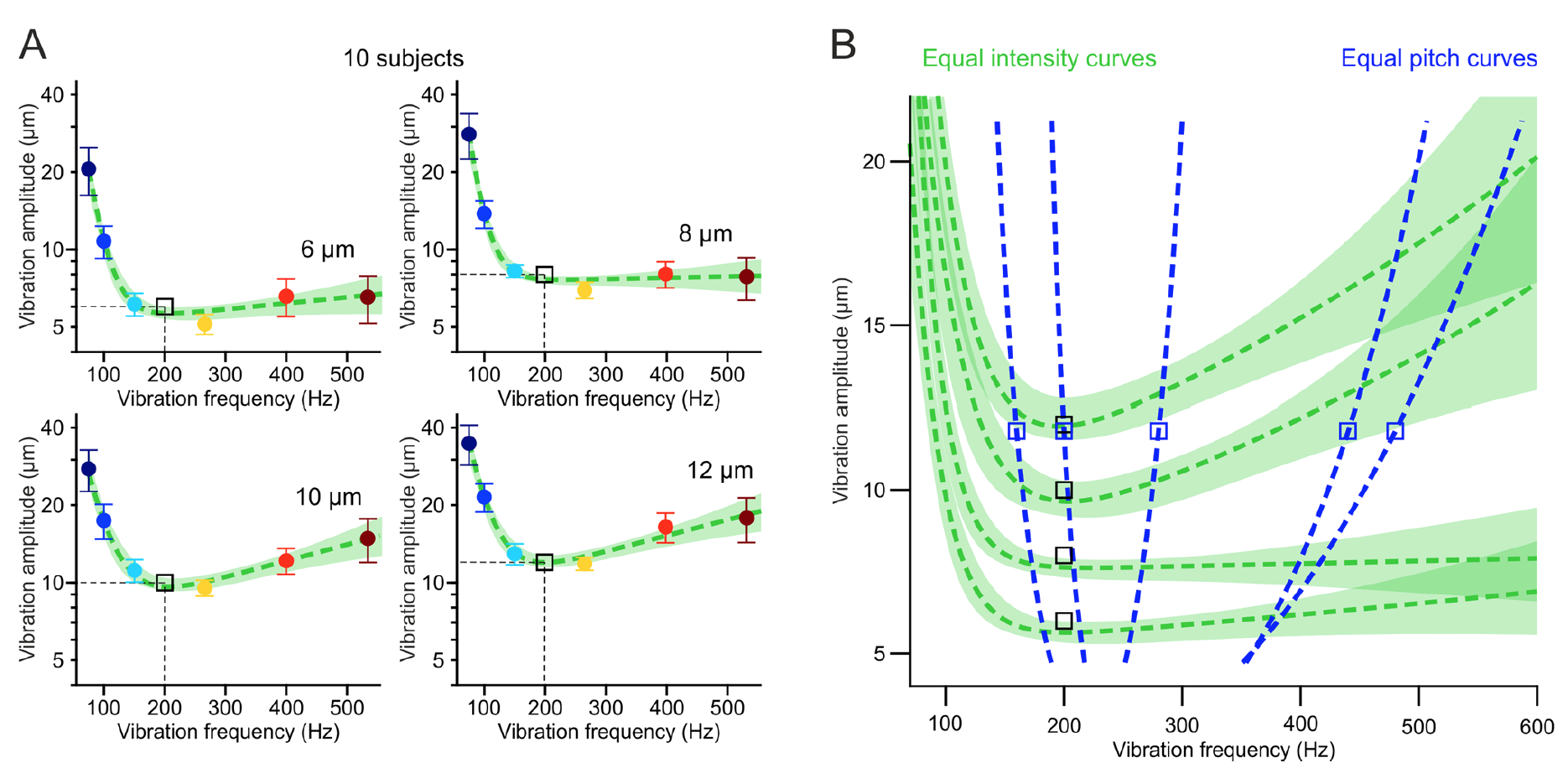 Как и в предыдущим эксперименте, путем количественной оценки сдвига психометрических соответствий (по оси амплитуды), вызванного изменениями частоты стандартного стимула, были получены кривые интенсивности (4A). Пары амплитуда / частота, попадающие на каждую кривую, воспринимаются с той же интенсивностью, что и вибрация в 200 Гц при соответствующей стандартной амплитуде (черные квадраты на 4A).