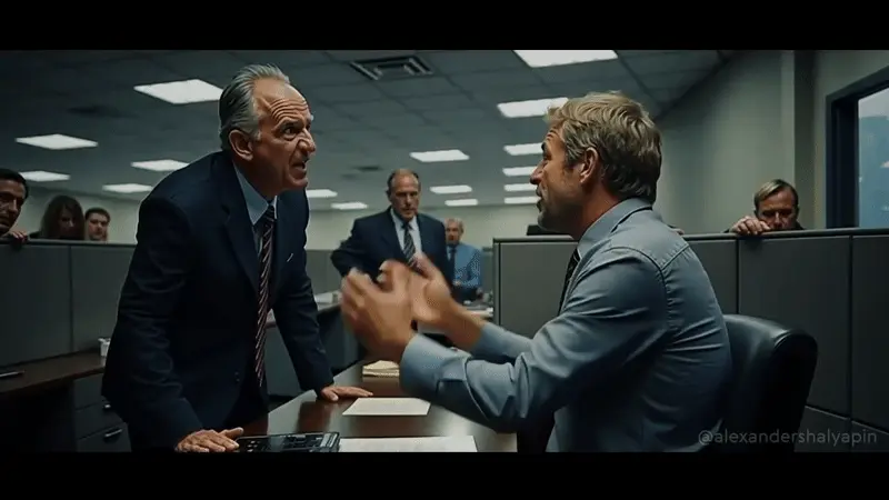 Мрачный офис с серыми стенами, мерцающими флуоресцентными лампами и захламленными столами. Разъяренный босс в помятом костюме склонился над сотрудником, кричит, держа в руках документ, вены вздуваются. Сотрудник съеживается в кресле, избегая смотреть в глаза, а коллеги нервно выглядывают из-за стен кабинок, в воздухе чувствуется напряжение.