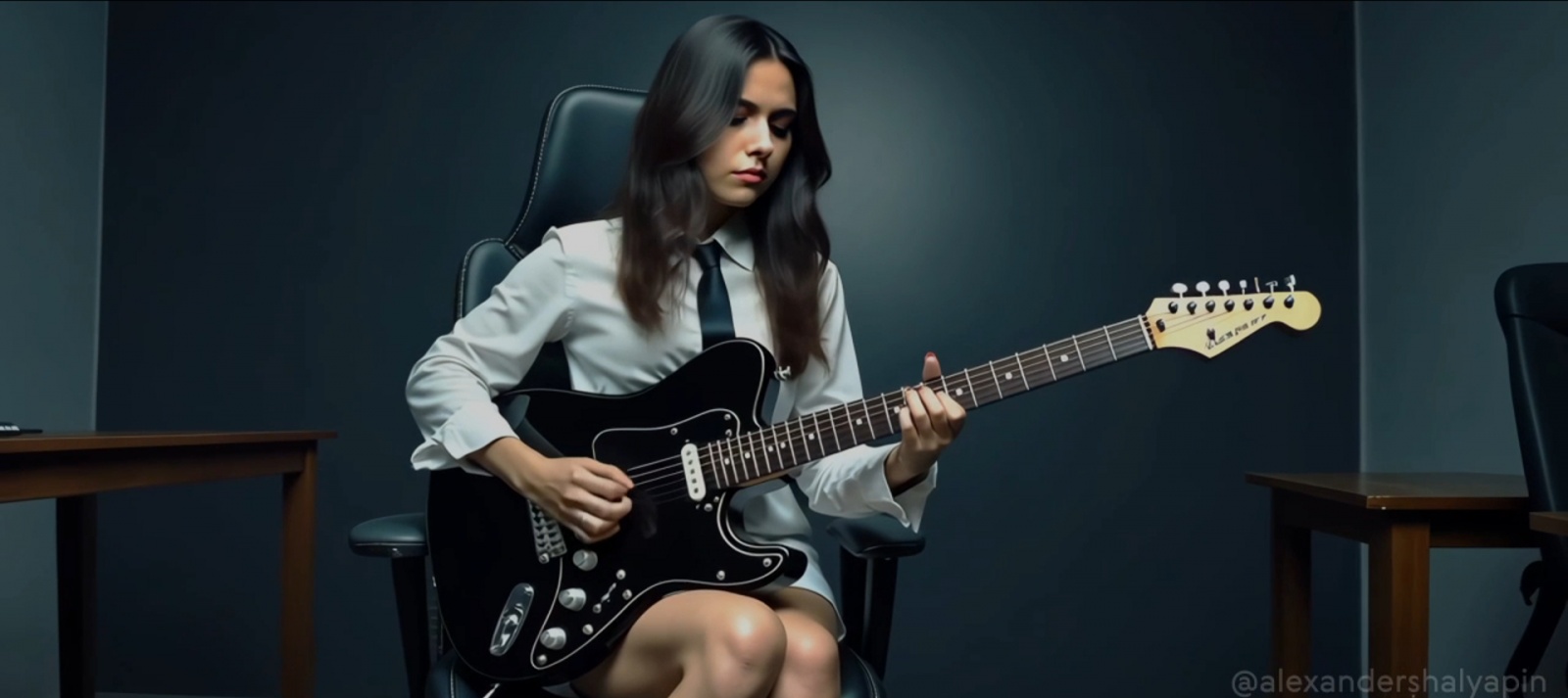 Кинематографическая съемка в середине тела в тускло освещенном, пустом офисе ночью, наполненном холодной и пустынной атмосферой. Композиция тщательно сбалансирована, объект съемки расположен немного не по центру. Цветокоррекция выполнена в ненасыщенной, холодной тональной палитре с едва заметными синими и зелеными оттенками, подчеркивающими стерильность и безжизненность корпоративной среды. Глубина резкости умеренная, женщина и гитара находятся в резком фокусе, а фон размыт до мягкости. Освещение – угрюмое и направленное, основной источник – одинокая настольная лампа, которая отбрасывает на объект сфокусированный свет, создавая глубокие тени, подчеркивающие одиночество и неподвижность момента. Кадр снят под небольшим углом, что усиливает ощущение самоанализа и тихого бунтарства. Изображение имеет кинематографическую зернистость и слегка недоэкспонировано, что придает ему атмосферную глубину. Среди пустых столов и приглушенных серых стен на офисном стуле сидит красивая молодая женщина, ее поза расслабленная, но целеустремленная, она сосредоточенно смотрит на гладкую черную электрогитару в своих руках. Ее голова наклонена вниз, а глаза следят за движением пальцев по грифельной доске. На ней чистая белая рубашка со слегка закатанными рукавами, ослабленный галстук, короткая юбка и начищенные туфли – намеренный контраст со строгой формальностью ее окружения. Мягкий свет лампы подчеркивает изгибы гитары и острые углы ее наряда, в то время как остальная часть комнаты растворяется в тени, усиливая ощущение изолированности и тихого неповиновения.