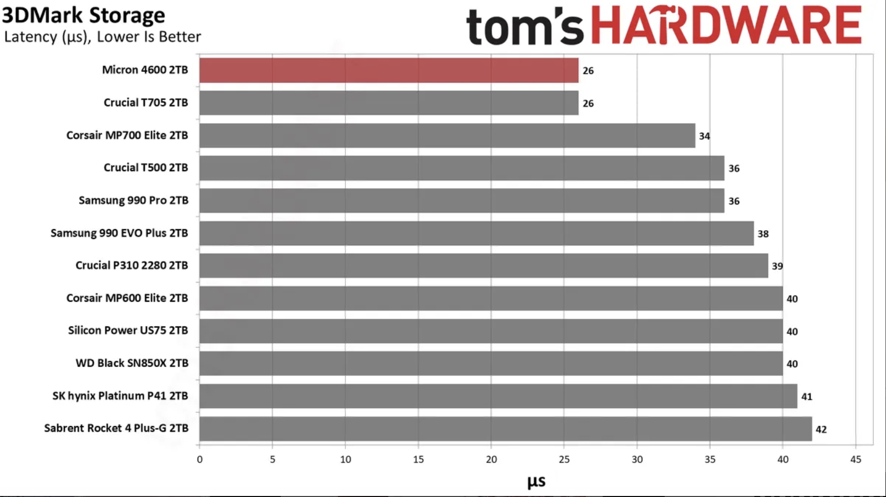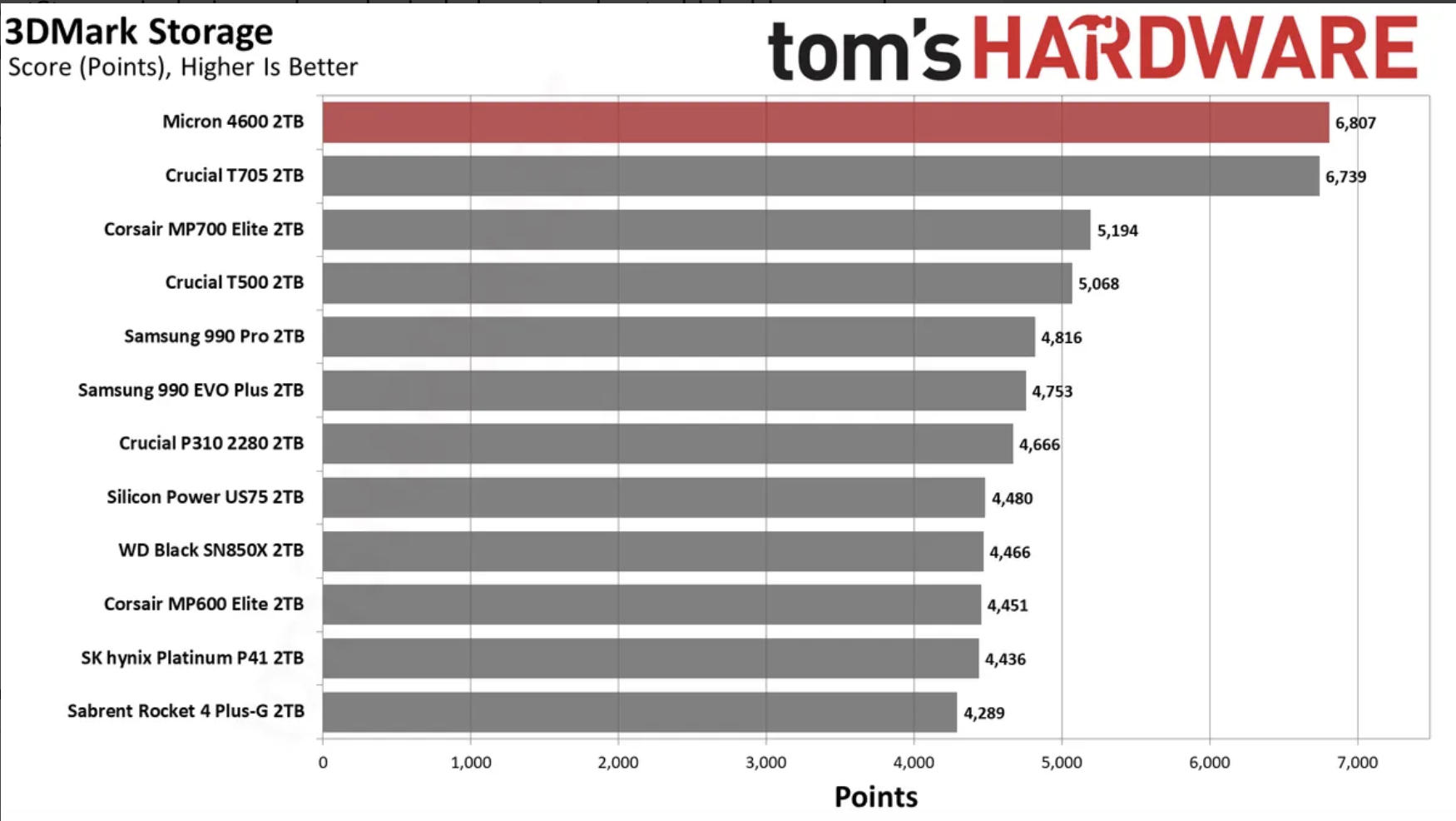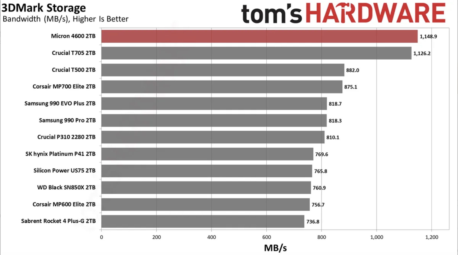 Micron 4600 показывает лучшие результаты в бенчмарке 3DMark Storage Benchmark. Он фактически сравнялся с T705, накопителем, использующим другой контроллер и более старую флэш-память, поэтому для игр не нужно идти на любые компромиссы, чтобы получить превосходную энергоэффективность 4600. Посмотрим, изменится ли ситуация, когда появится больше игр с DirectStorage, хотя мы ожидаем, что 4600 будет достаточно надежным в будущем.