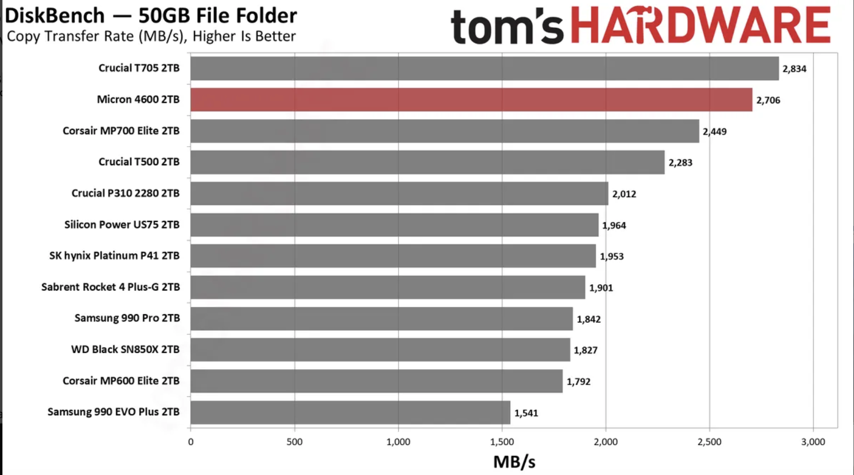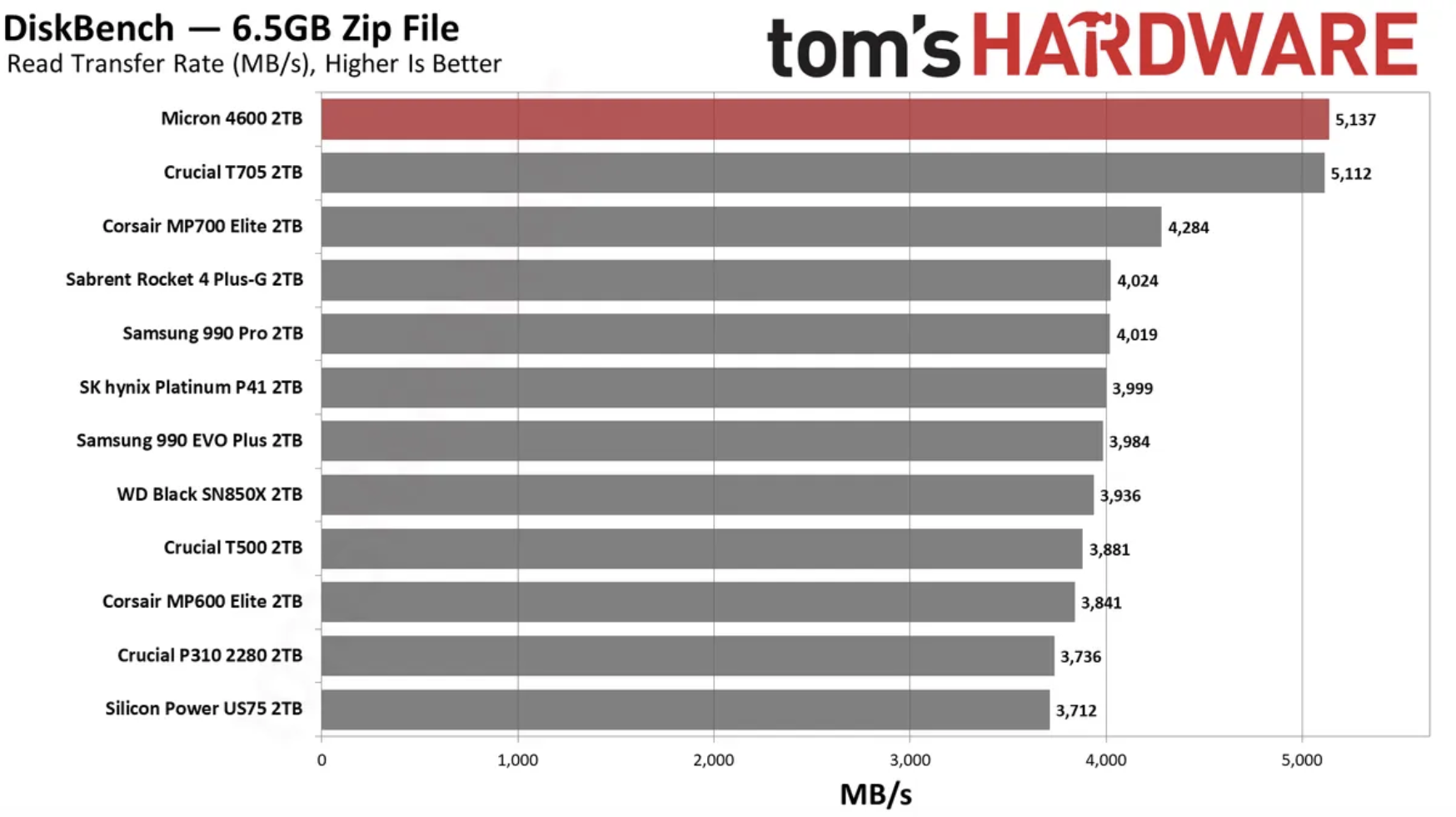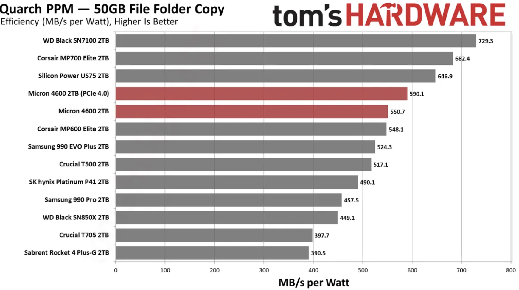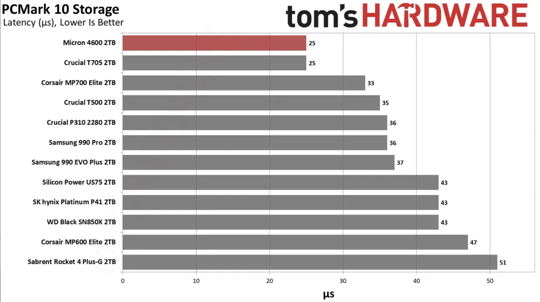 Micron 4600 показывает лучшие результаты в бенчмарке 3DMark Storage Benchmark. Он фактически сравнялся с T705, накопителем, использующим другой контроллер и более старую флэш-память, поэтому для игр не нужно идти на любые компромиссы, чтобы получить превосходную энергоэффективность 4600. Посмотрим, изменится ли ситуация, когда появится больше игр с DirectStorage, хотя мы ожидаем, что 4600 будет достаточно надежным в будущем.