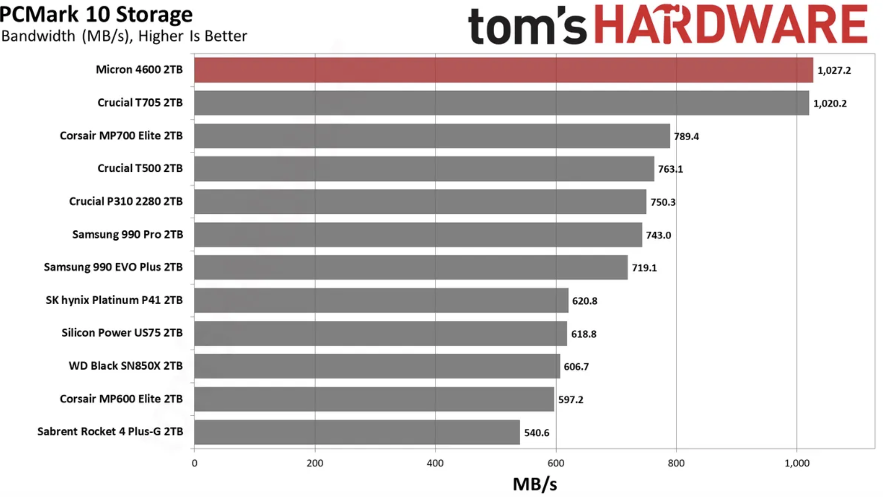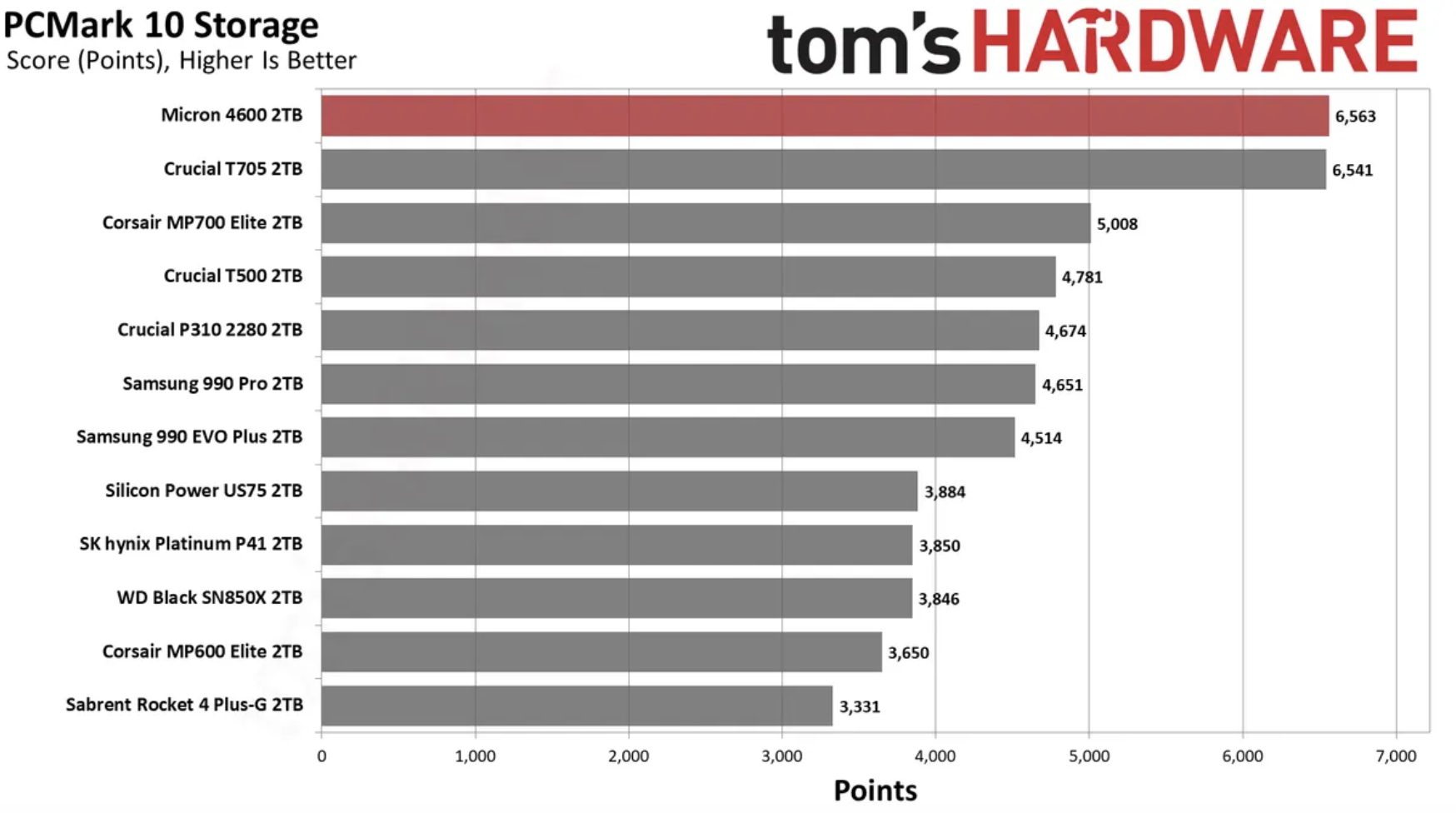Обычно, но не всегда, результаты PCMark 10 Storage Benchmark совпадают с результатами 3DMark Storage Benchmark. В случае с 4600 все совпадает, и накопитель лишь едва обходит T705. Это чрезвычайно высокая производительность даже по сравнению с самыми быстрыми бюджетными SSD с интерфейсом PCIe 5.0, такими как MP700 Elite.