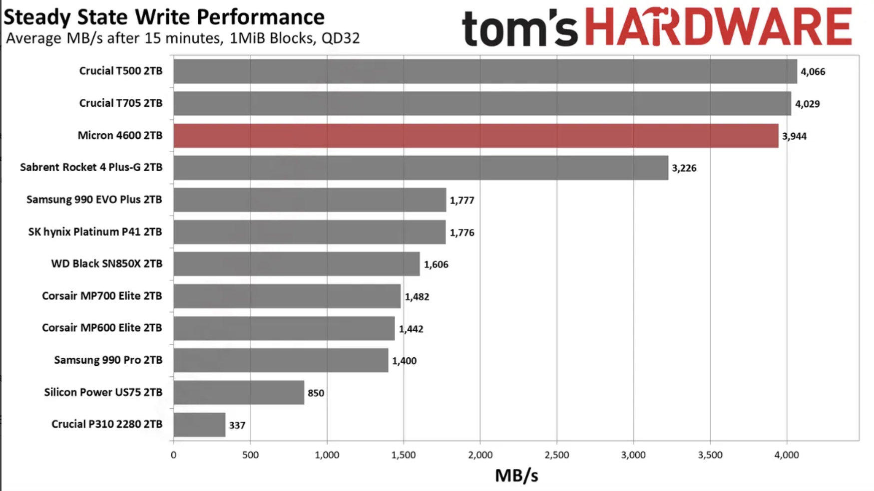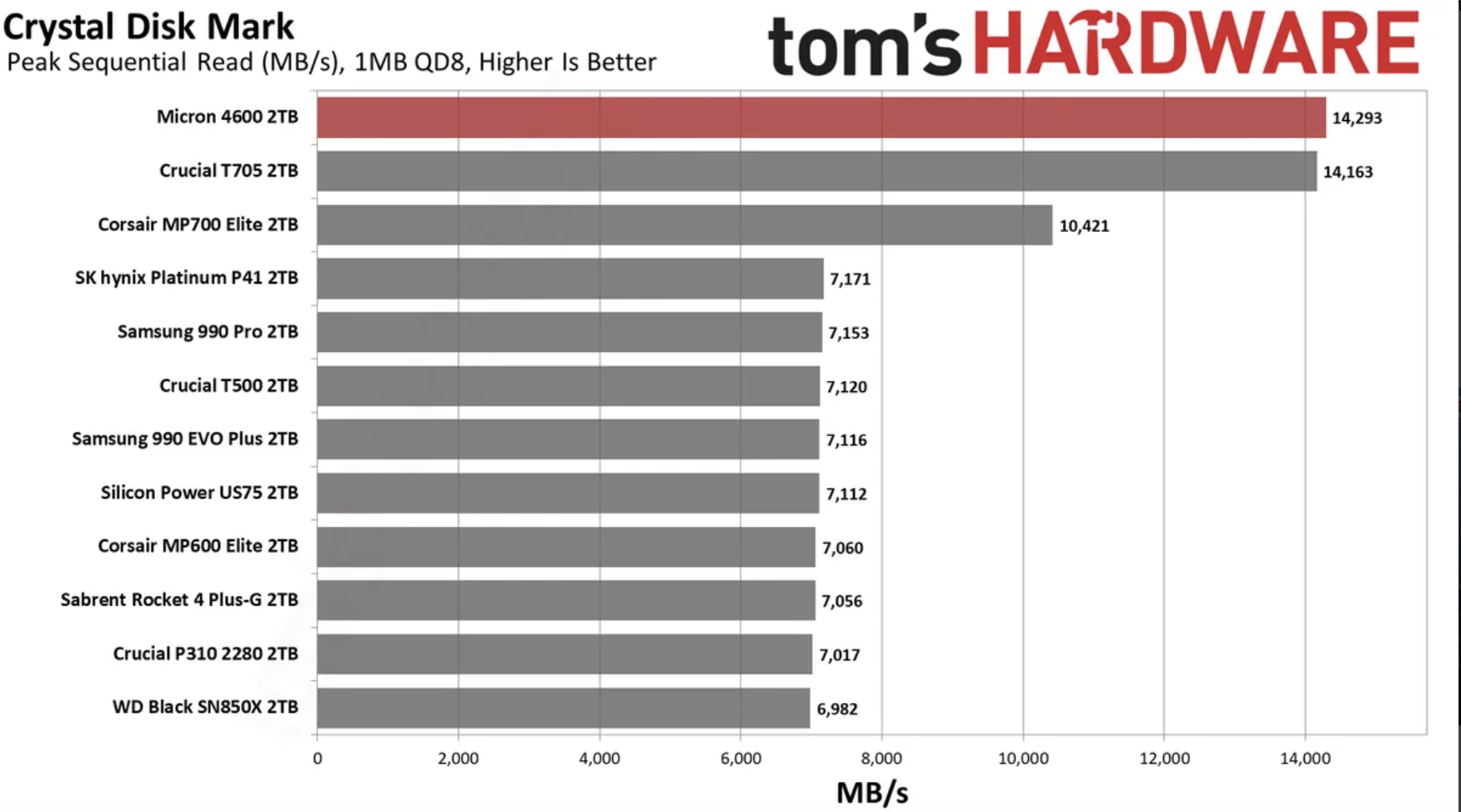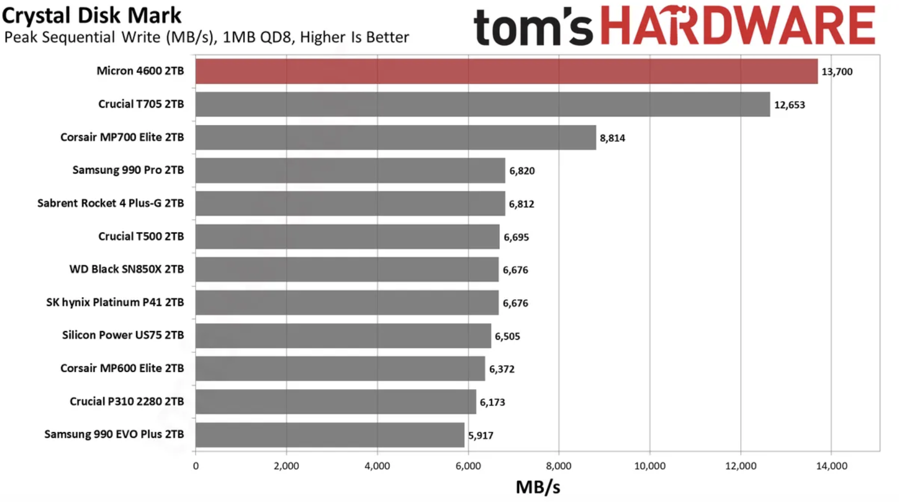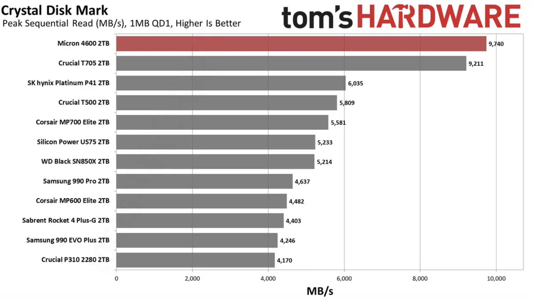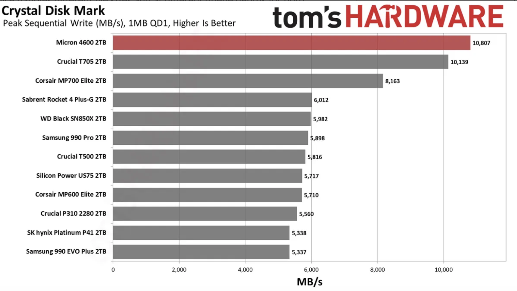 Micron 4600 будет стремиться к вершине иерархии SSD-бенчмарков, и поэтому мы хотим протестировать его с самыми лучшими и самыми быстрыми конкурентами. На фронте PCIe 5.0 мы включили Crucial T705 в качестве нашего постоянного чемпиона Phison E26. Более дешевые диски 5.0, такие как Corsair MP700 Elite с Phison E31T, также потенциально конкурентоспособны. Среди лучших накопителей 4.0 — Samsung 990 Pro, WD Black SN850X, Sabrent Rocket 4 Plus-G и SK hynix Platinum P41. Мы также включаем в эту категорию Crucial T500 и более новые WD Black SN7100, поскольку они особенно хороши для ноутбуков. Еще один накопитель, который, скорее всего, предназначен для ноутбуков, — Samsung 990 EVO Plus. Наконец, к бюджетным накопителям относятся Corsair MP600 Elite и Silicon Power US75, хотя, по слухам, более новые диски US75 начали поставляться с QLC NAND и поэтому работают не так хорошо.