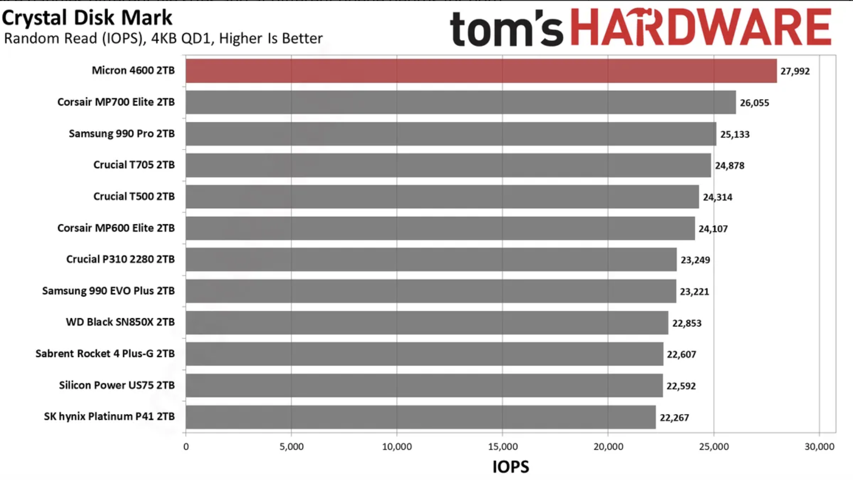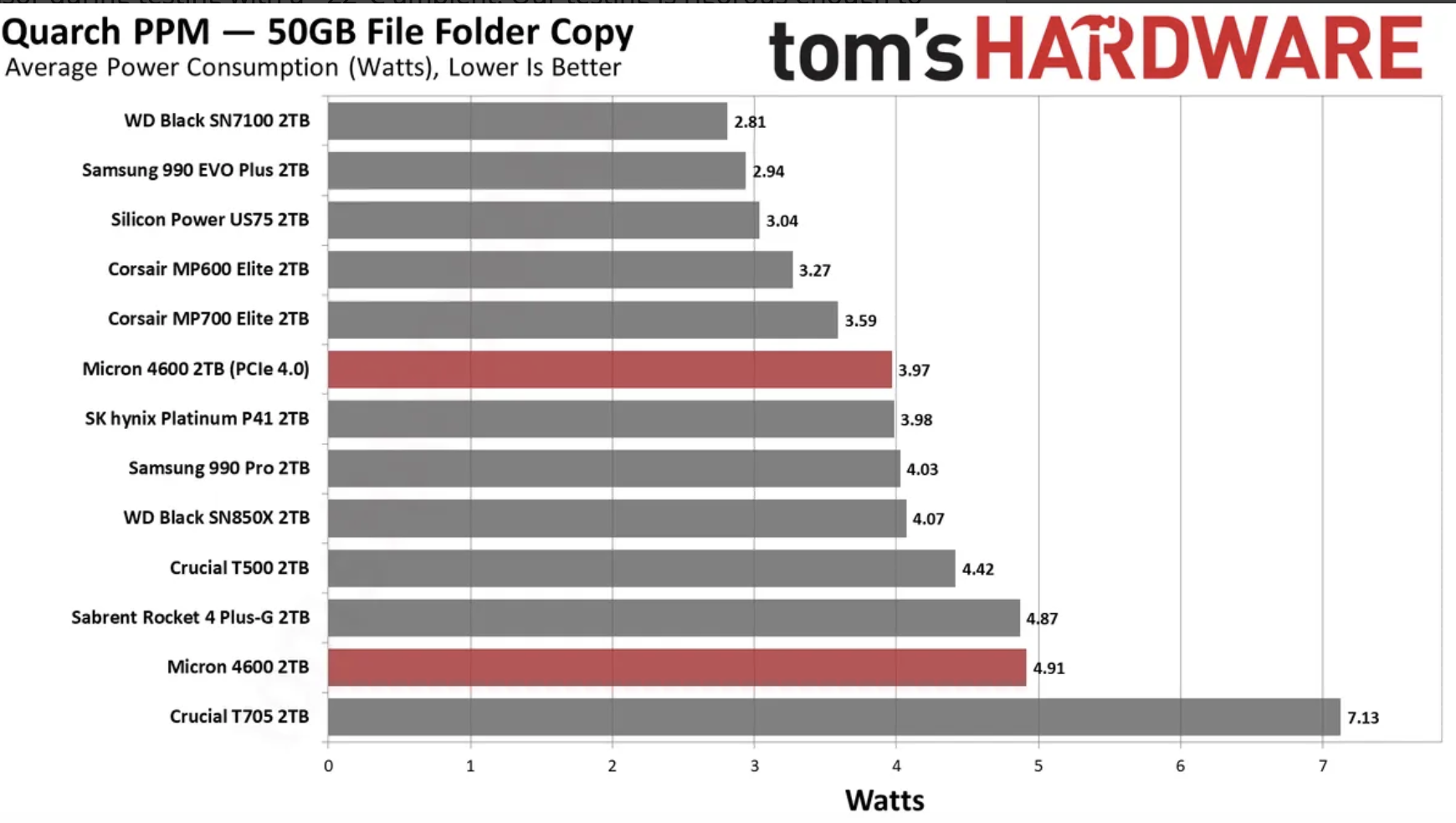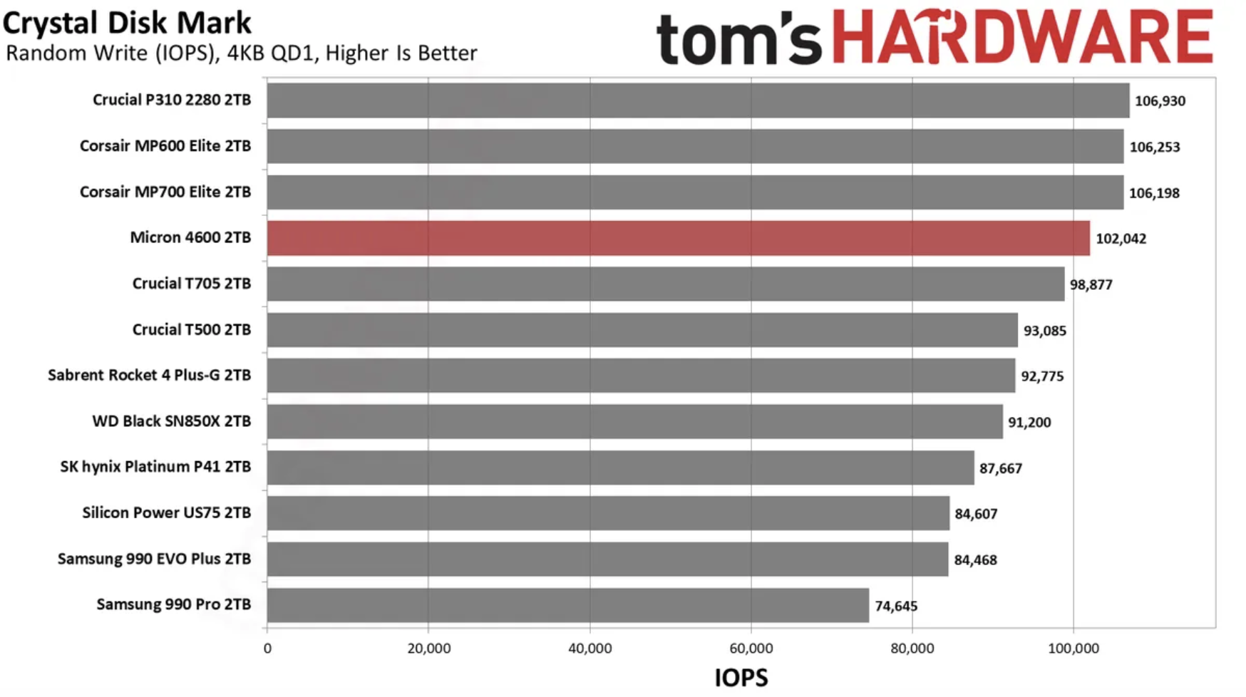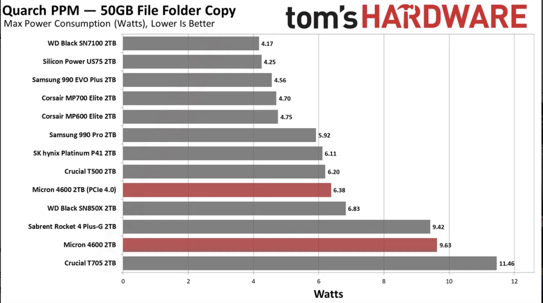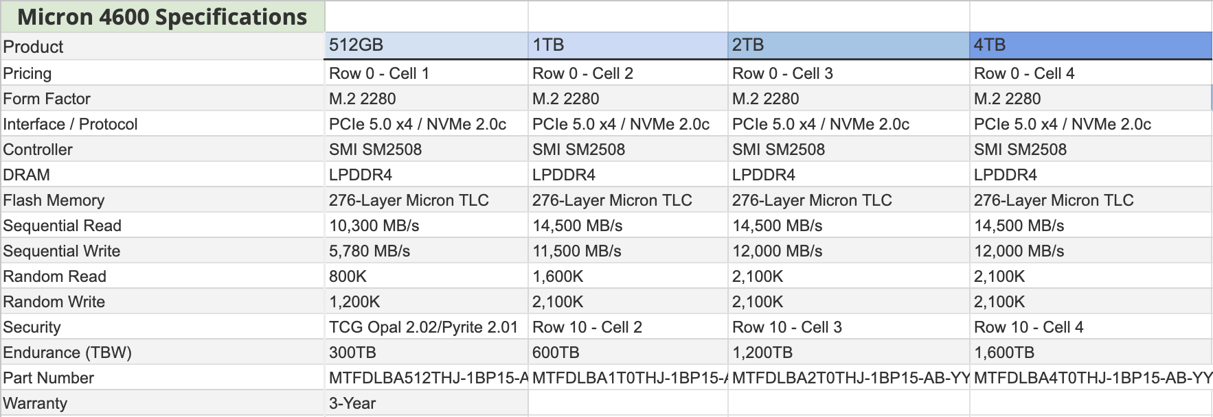 Micron 4600 будет стремиться к вершине иерархии SSD-бенчмарков, и поэтому мы хотим протестировать его с самыми лучшими и самыми быстрыми конкурентами. На фронте PCIe 5.0 мы включили Crucial T705 в качестве нашего постоянного чемпиона Phison E26. Более дешевые диски 5.0, такие как Corsair MP700 Elite с Phison E31T, также потенциально конкурентоспособны. Среди лучших накопителей 4.0 — Samsung 990 Pro, WD Black SN850X, Sabrent Rocket 4 Plus-G и SK hynix Platinum P41. Мы также включаем в эту категорию Crucial T500 и более новые WD Black SN7100, поскольку они особенно хороши для ноутбуков. Еще один накопитель, который, скорее всего, предназначен для ноутбуков, — Samsung 990 EVO Plus. Наконец, к бюджетным накопителям относятся Corsair MP600 Elite и Silicon Power US75, хотя, по слухам, более новые диски US75 начали поставляться с QLC NAND и поэтому работают не так хорошо.