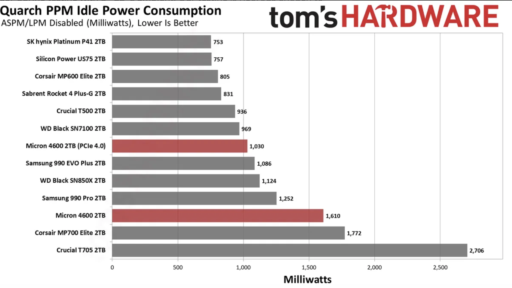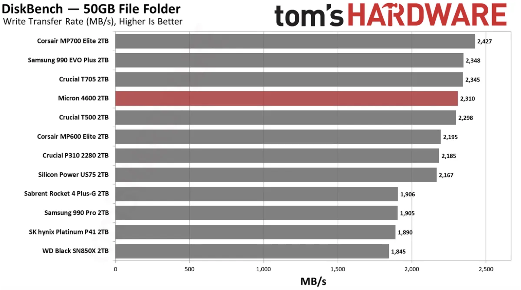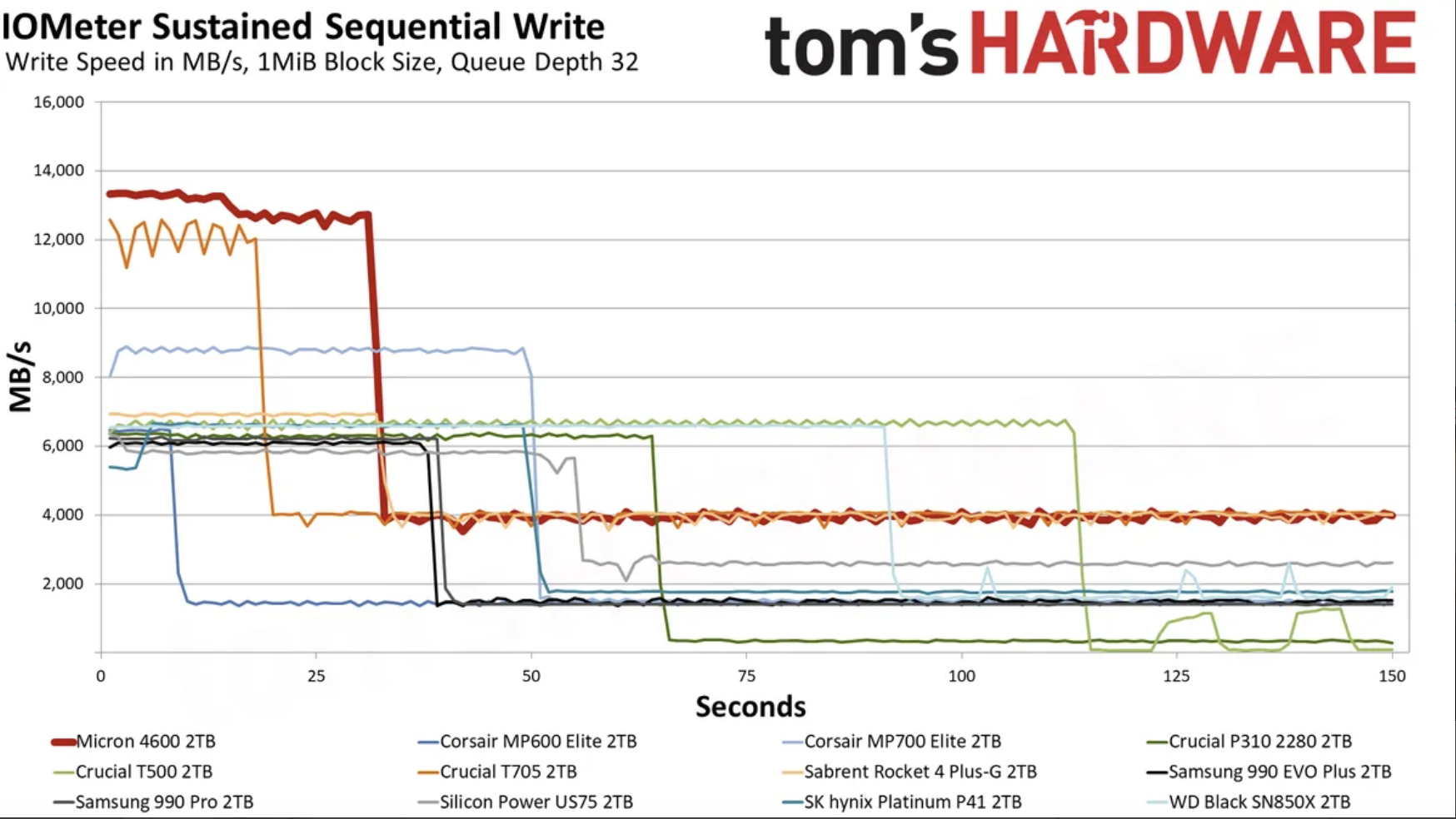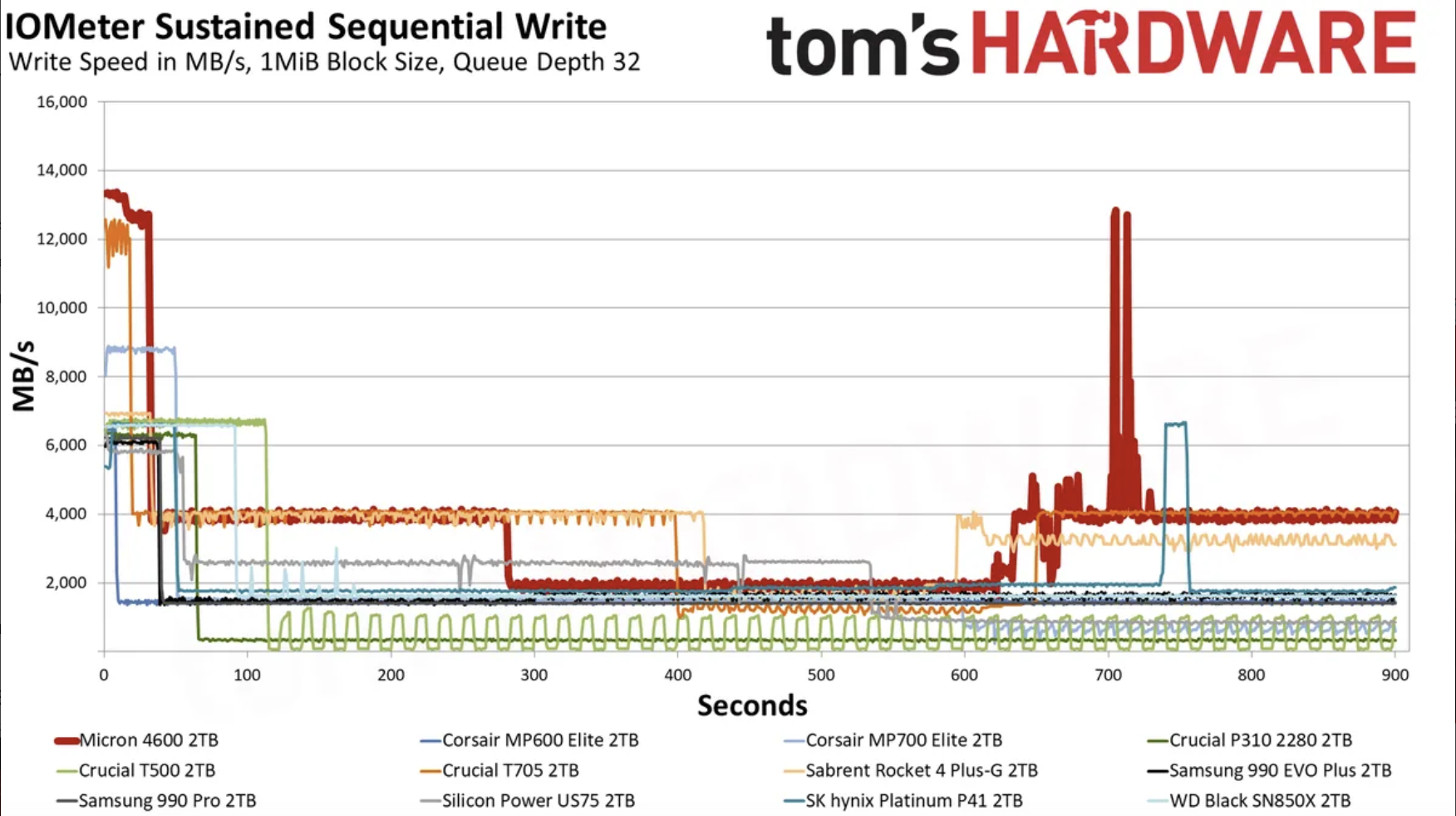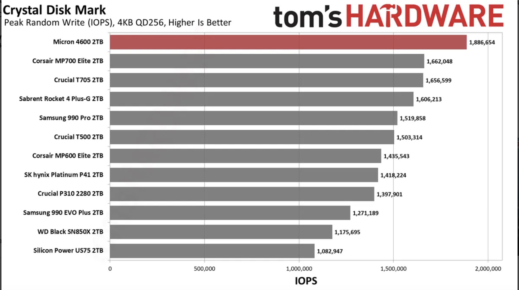 Micron 4600 будет стремиться к вершине иерархии SSD-бенчмарков, и поэтому мы хотим протестировать его с самыми лучшими и самыми быстрыми конкурентами. На фронте PCIe 5.0 мы включили Crucial T705 в качестве нашего постоянного чемпиона Phison E26. Более дешевые диски 5.0, такие как Corsair MP700 Elite с Phison E31T, также потенциально конкурентоспособны. Среди лучших накопителей 4.0 — Samsung 990 Pro, WD Black SN850X, Sabrent Rocket 4 Plus-G и SK hynix Platinum P41. Мы также включаем в эту категорию Crucial T500 и более новые WD Black SN7100, поскольку они особенно хороши для ноутбуков. Еще один накопитель, который, скорее всего, предназначен для ноутбуков, — Samsung 990 EVO Plus. Наконец, к бюджетным накопителям относятся Corsair MP600 Elite и Silicon Power US75, хотя, по слухам, более новые диски US75 начали поставляться с QLC NAND и поэтому работают не так хорошо.