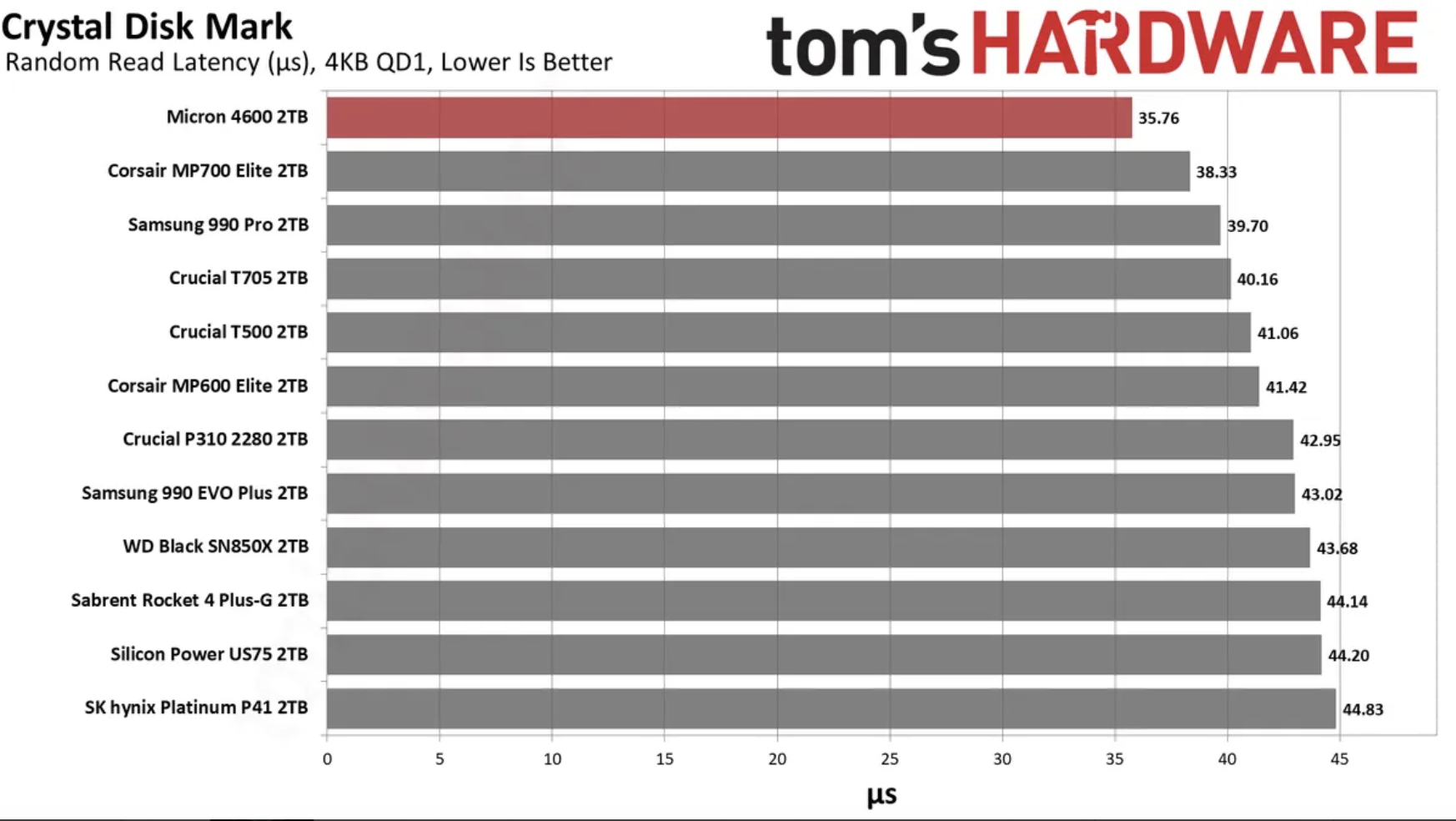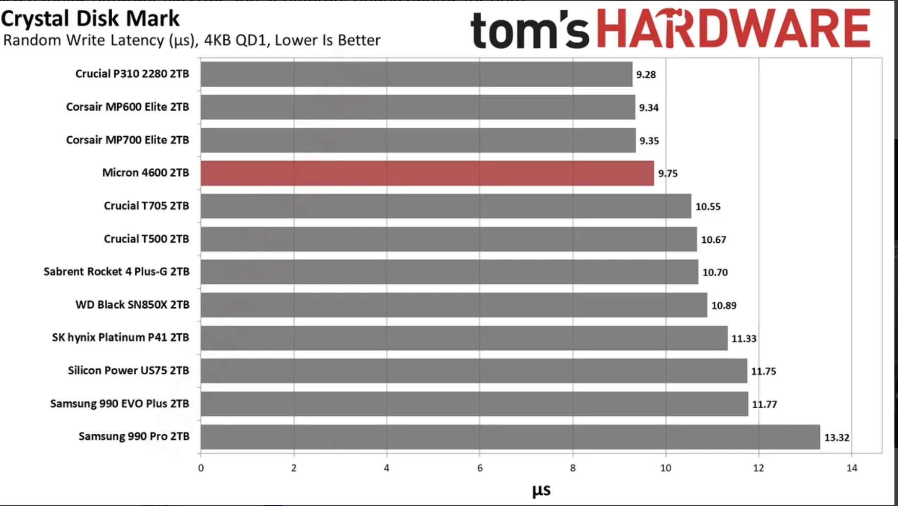 Если посмотреть на технические характеристики новой флэш-памяти, в частности, в сравнении с предыдущим поколением от Micron, то можно заметить, что были предприняты определенные усилия для повышения производительности чтения в 4K. Это подтверждается результатами CDM, где 4600 демонстрирует одни из лучших результатов по задержке случайного чтения 4 КБ QD1, которые мы когда-либо видели. Это очень важно, поскольку данная конкретная рабочая нагрузка напрямую связана с реальным «ощущением» SSD.