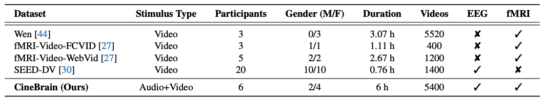 Авторы статьи справедливо указывают на этот пробел: существующие датасеты часто содержат либо только фМРТ, либо только ЭЭГ данные, и/или используют простые стимулы (статичные картинки, отдельные звуки). А можно ли обьединить сильные стороны фМРТ и ЭЭГ, чтобы получить более полную картину и лучше декодировать мозговую активность при просмотре естественного видео?