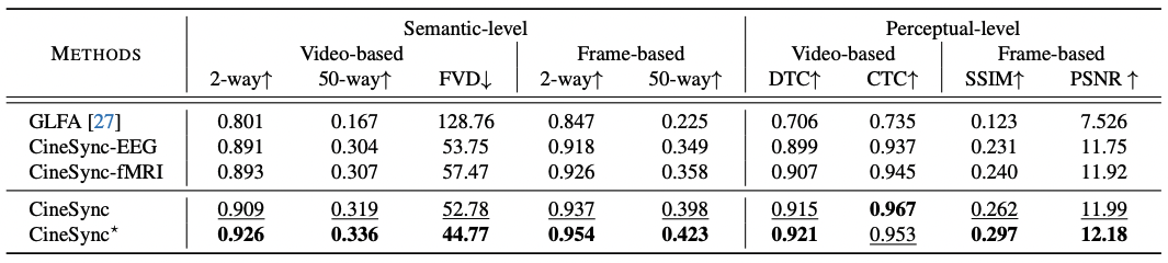 CineSyncдостиг передового уровня качества (SOTA) в задаче реконструкции видео из сигналов мозга на новом датасетеCineBrain. -
