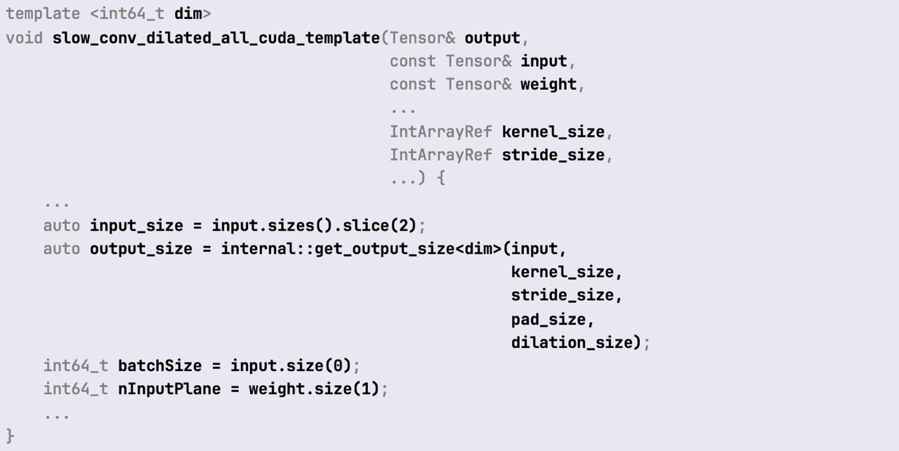 Тут можно еще обратить внимание на макрос AT_DISPATCH_FLOATING_TYPES_AND2. Он нужен, чтобы вызвать конкретную реализацию свертки в зависимости от типа входного тензора.