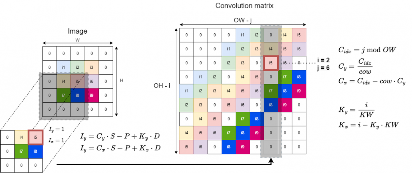 Допустим, в ядре мы получим положение ячейки I5, которая находится в шестом столбце. Из этих индексов можем рассчитать, в каком месте к исходному изображению был применен фильтр. Затем в соответствии с размерами фильтра пройтись по нужным значениям в исходном изображении и заполнить этот столбец. Каждый столбец в convolution-матрице соответствует одному применению фильтра.