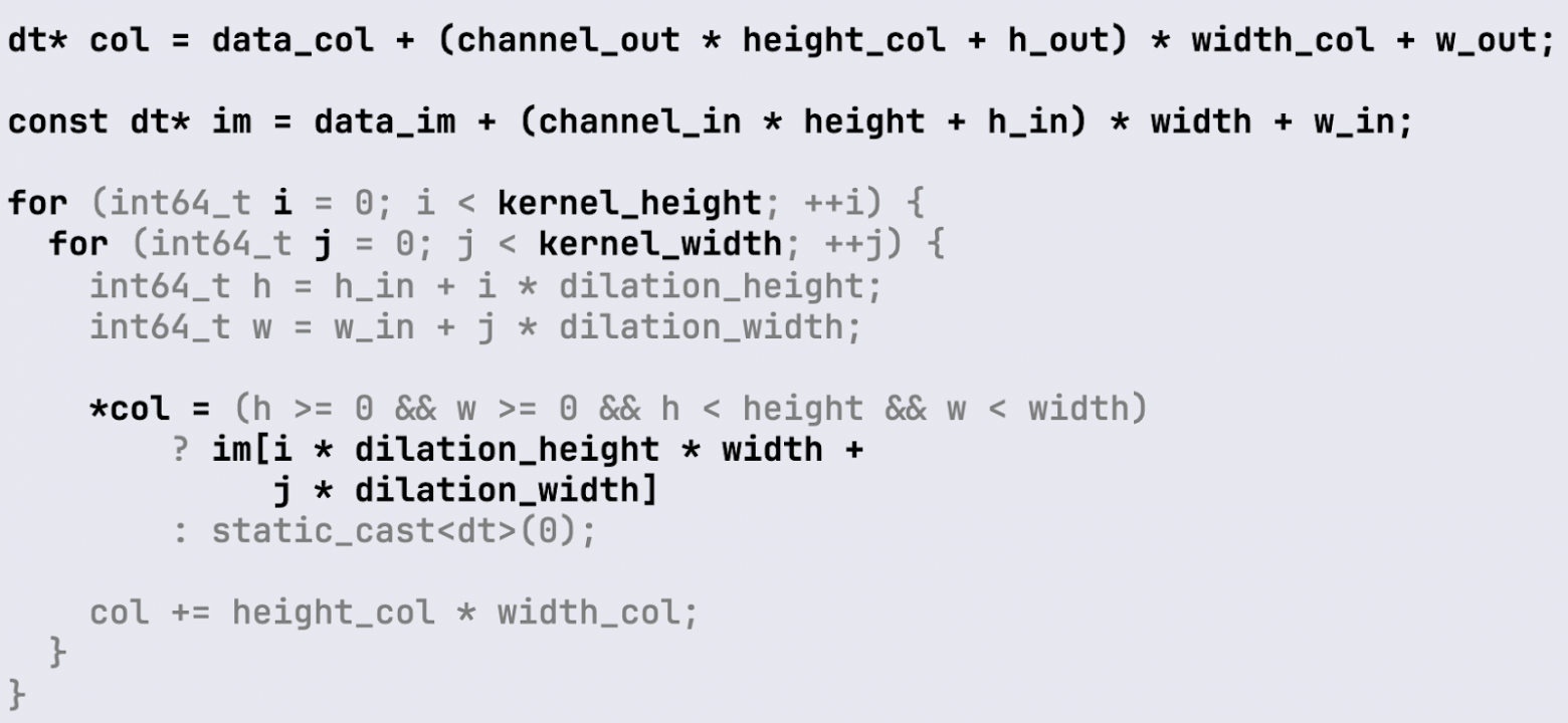 Когда рассчитали начальные индексы, мы вычисляем указатели на данные. col — это указатель на данные convolution-матрицы. im — это исходные данные изображения.