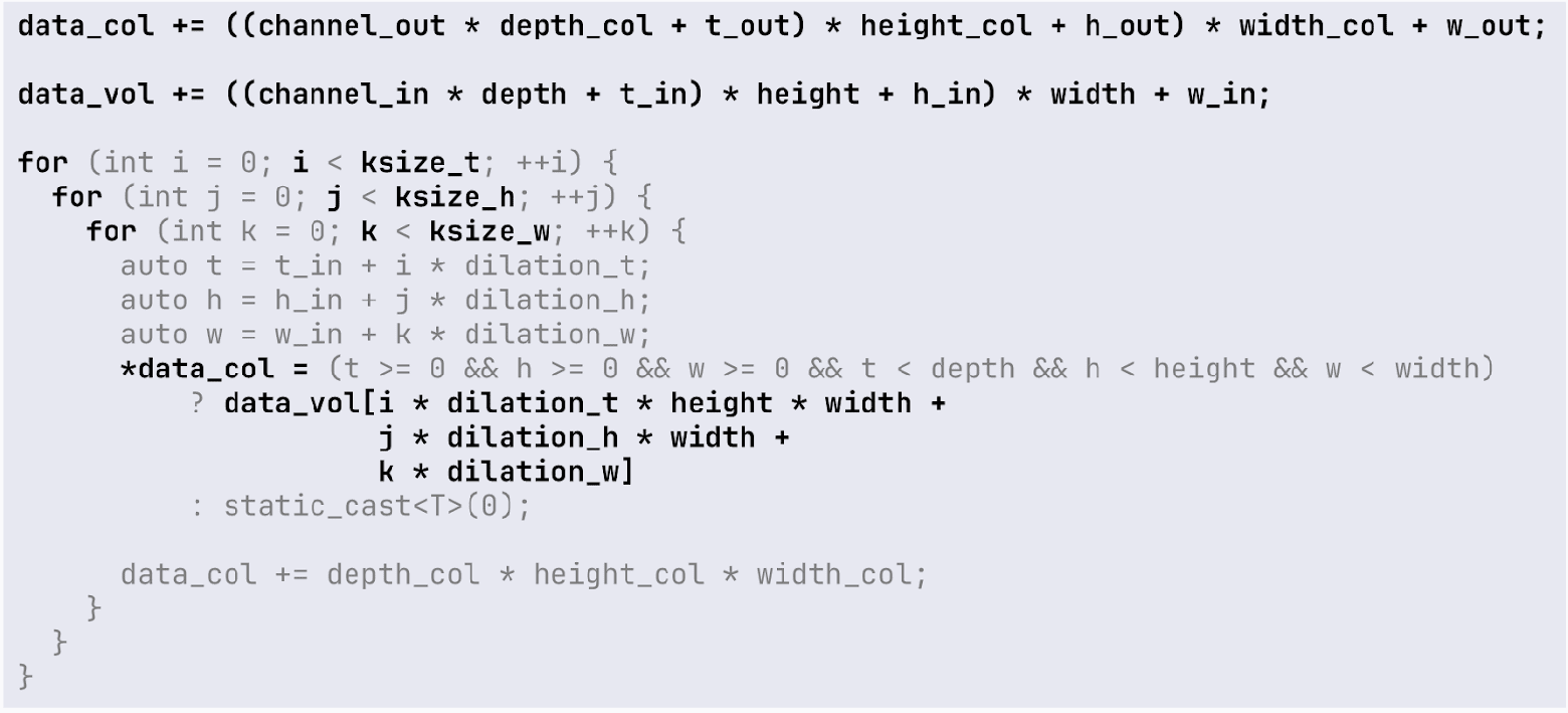 Внутри CUDA-ядра (функции, которая будет запущена в наших CUDA-потоках, как и в первом примере) мы должны вычислить сначала индексы данных, с которыми будем работать, в зависимости от индекса ядра. В PyTorch есть специальные макросы для работы с индексацией. Например, CUDA_KERNEL_LOOP_TYPE, который позволяет получить индекс данных в зависимости от потока.