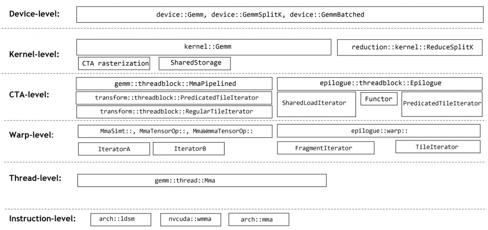 Библиотека предоставляет различные уровни специализации и конфигурирования: Device-level, Kernel-level, Block-level, warp, Instruction. Весь API представлен в виде шаблонов, из которых можно набирать те типы, которые потом инстанцируются для реализации нужного тайлинга.