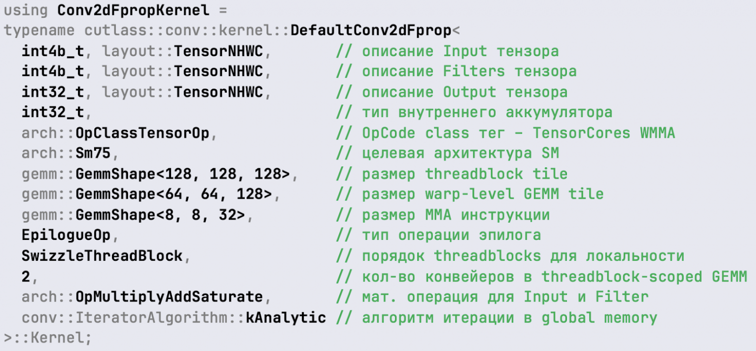 CUTLASS — это набор C++ шаблонов, поэтому сначала нужно сформировать набор типов, которые потом проинстанцируются в объект. Рассмотрим 2D-свертку: