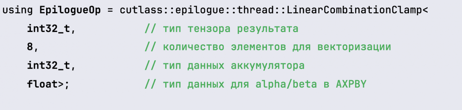 Обратите внимание, что в данном примере тип тензора и аккумулятора — это целочисленные значения, то есть четырехбайтный Integer. В CUTLASS можно использовать и Integer, и Floating point-типы, и смешанные типы вычислений.