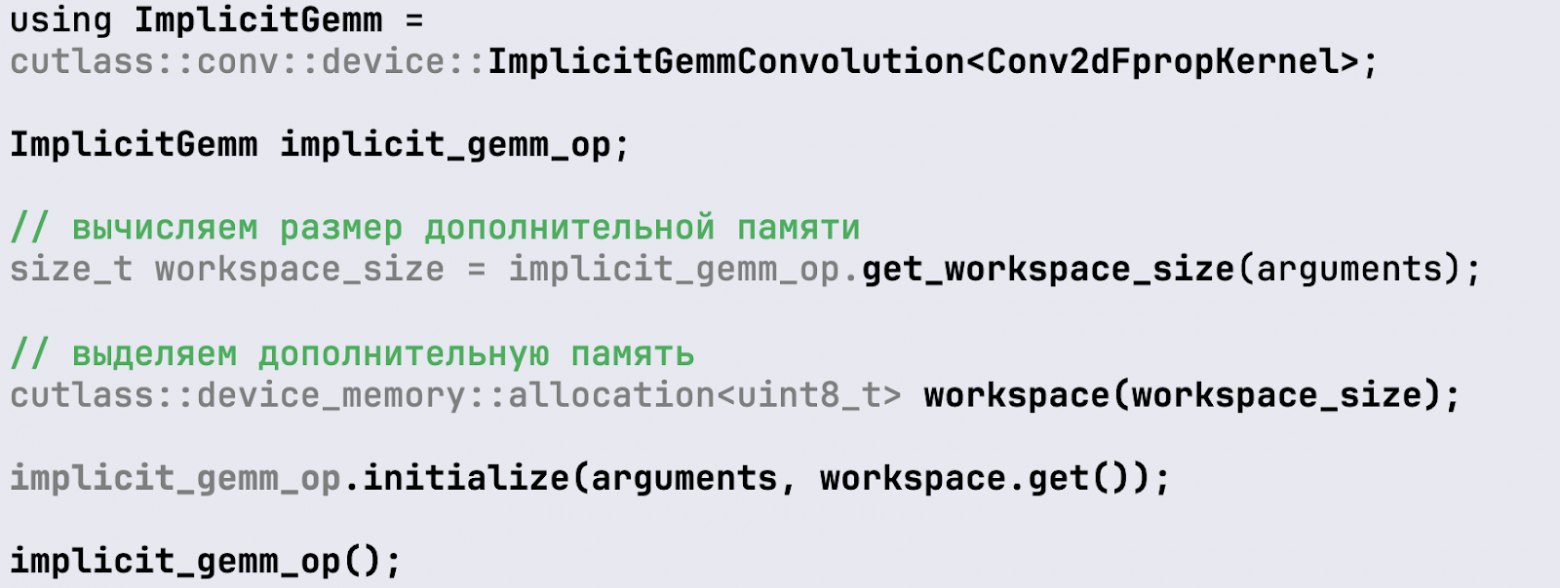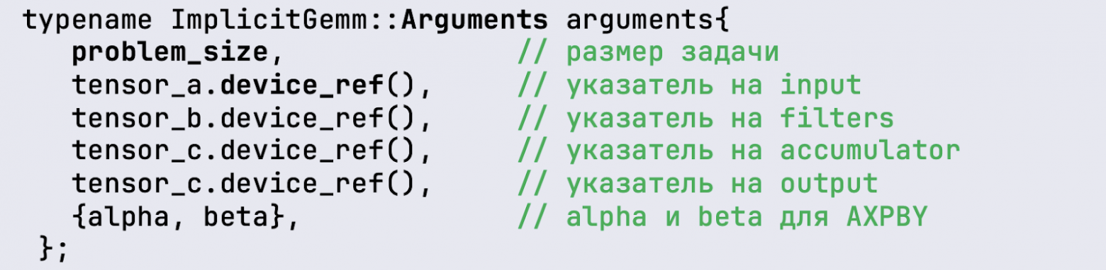 После того, как мы описали этот тип, мы можем его инстанцировать в виде implicit_gemm_op-объекта: