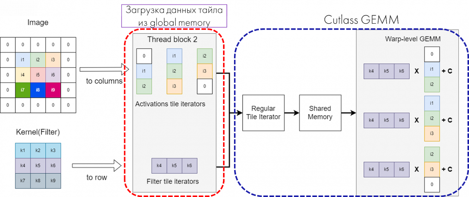 Все так же, как мы делали с cuBLAS. Мы добавляем еще одну размерность для исходного изображения и фильтра, чтобы вычислить, где находятся данные, используя координаты в выходной матрице и размеры свертки. Такие итераторы легко адаптируются к различным задачам. В CUTLASS приятно то, что нам не нужно переписывать много кода: мы просто используем этот итератор для создания одного из шаблонов для операции GEMM. Остальные части системы остаются без изменений. Это удобно, легко поддерживается и расширяется.