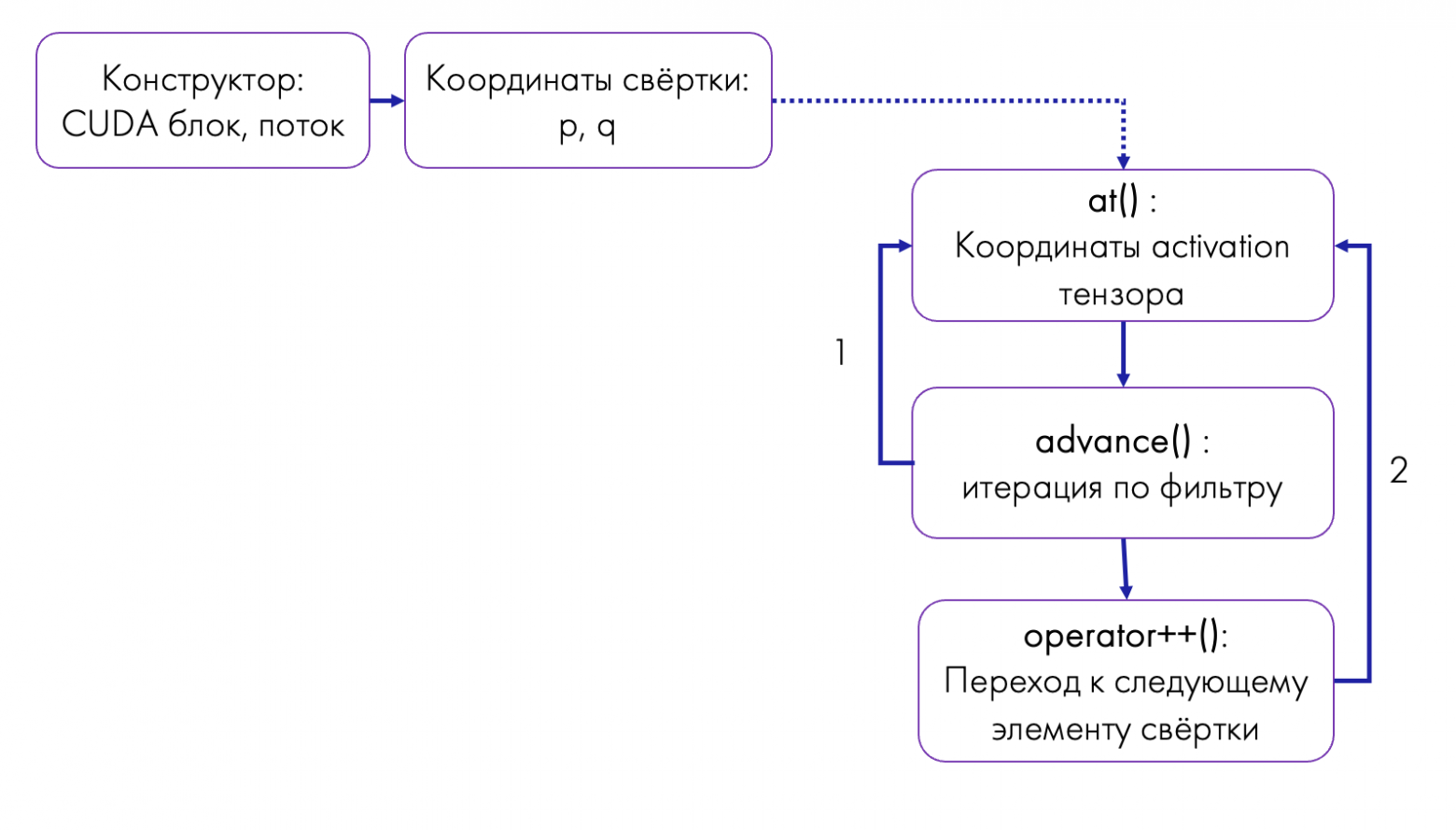 Итератор вызывается в каждом CUDA kernel, получает индекс с потока и блока, из них — координаты результата свертки в результирующей матрице (последняя формируется после применения фильтра). У него есть несколько методов: