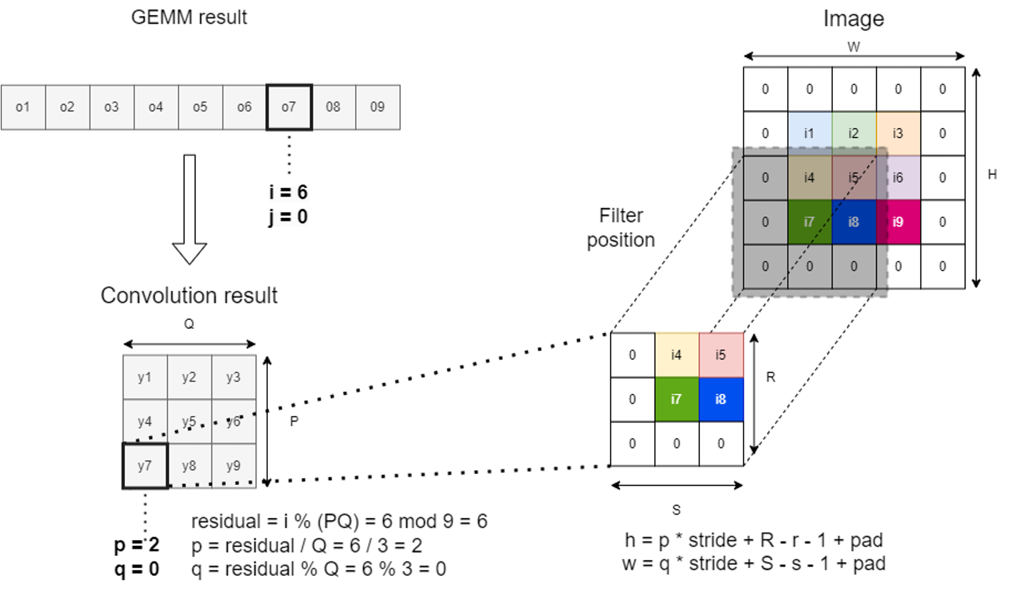 Вверху у нас тот же самый пример с изображением 3х3 и фильтром 3х3. Результат — девять значений свертки. Рассмотрим индексацию для результата GEMM с идентификатором o7. Это соответствует координатам в результате свертки y7=[2,0], так как после умножения мы получили матрицу 1х9, но на самом деле у нас двумерный результат 3х3.