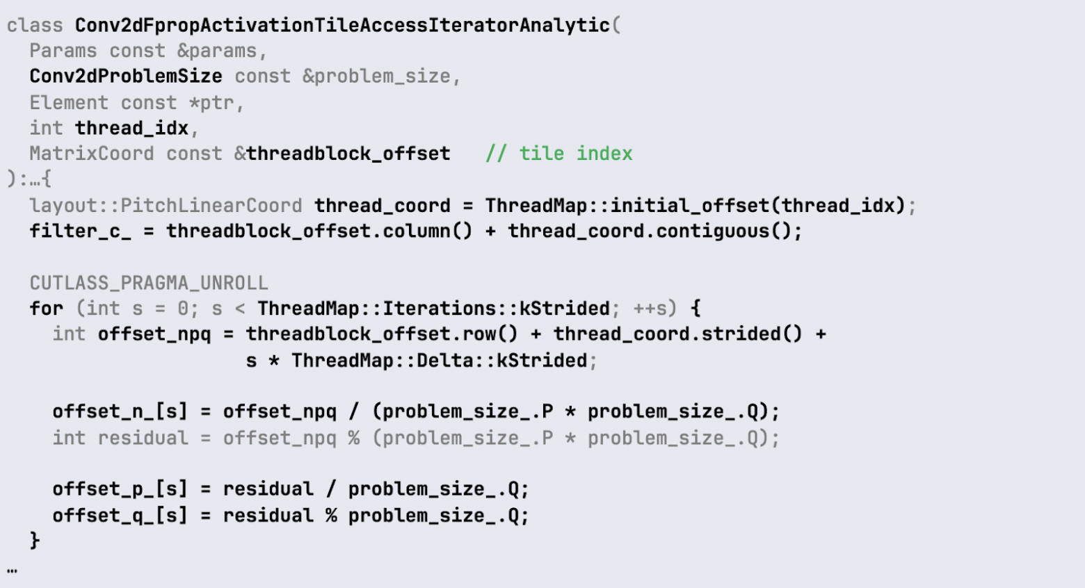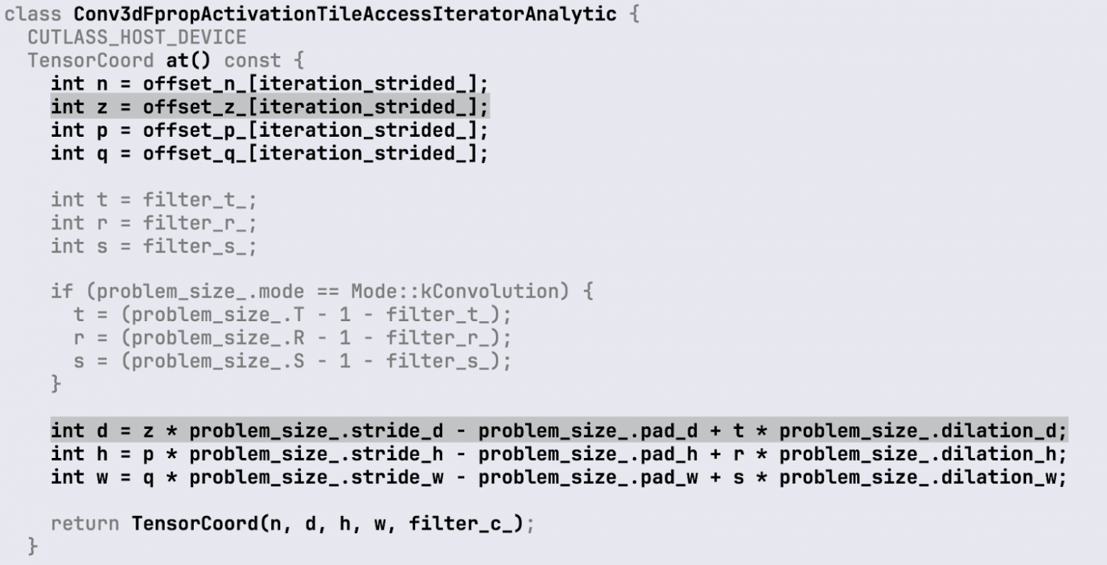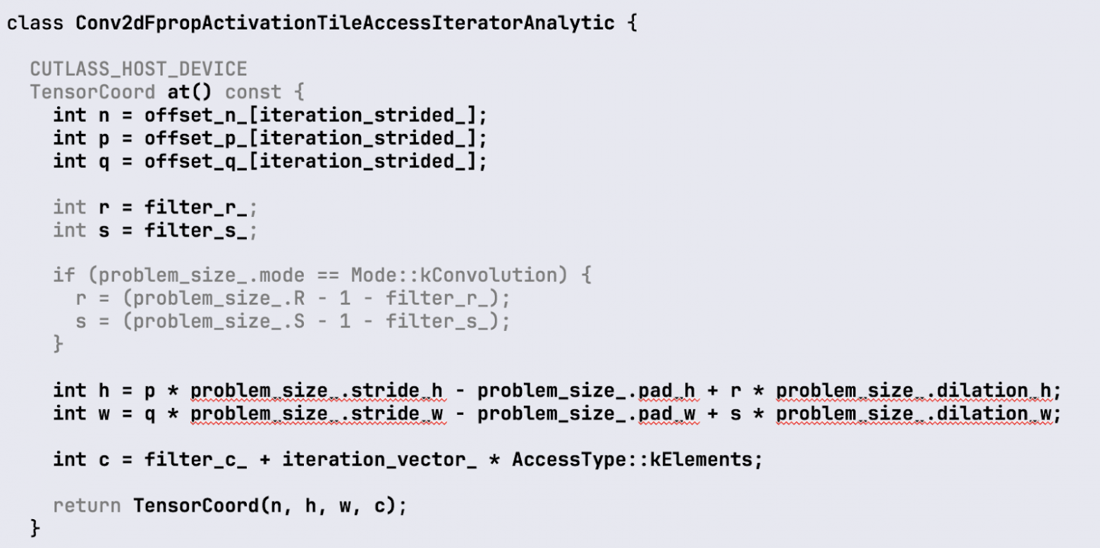 Обратите внимание на последний параметр со значением conv::IteratorAlgorithm::kAnalytic. Это значит, что все индексы и смещения, необходимые для получения значение из исходного сигнала и перекладывания их в shared-память, будут вычисляться на лету.