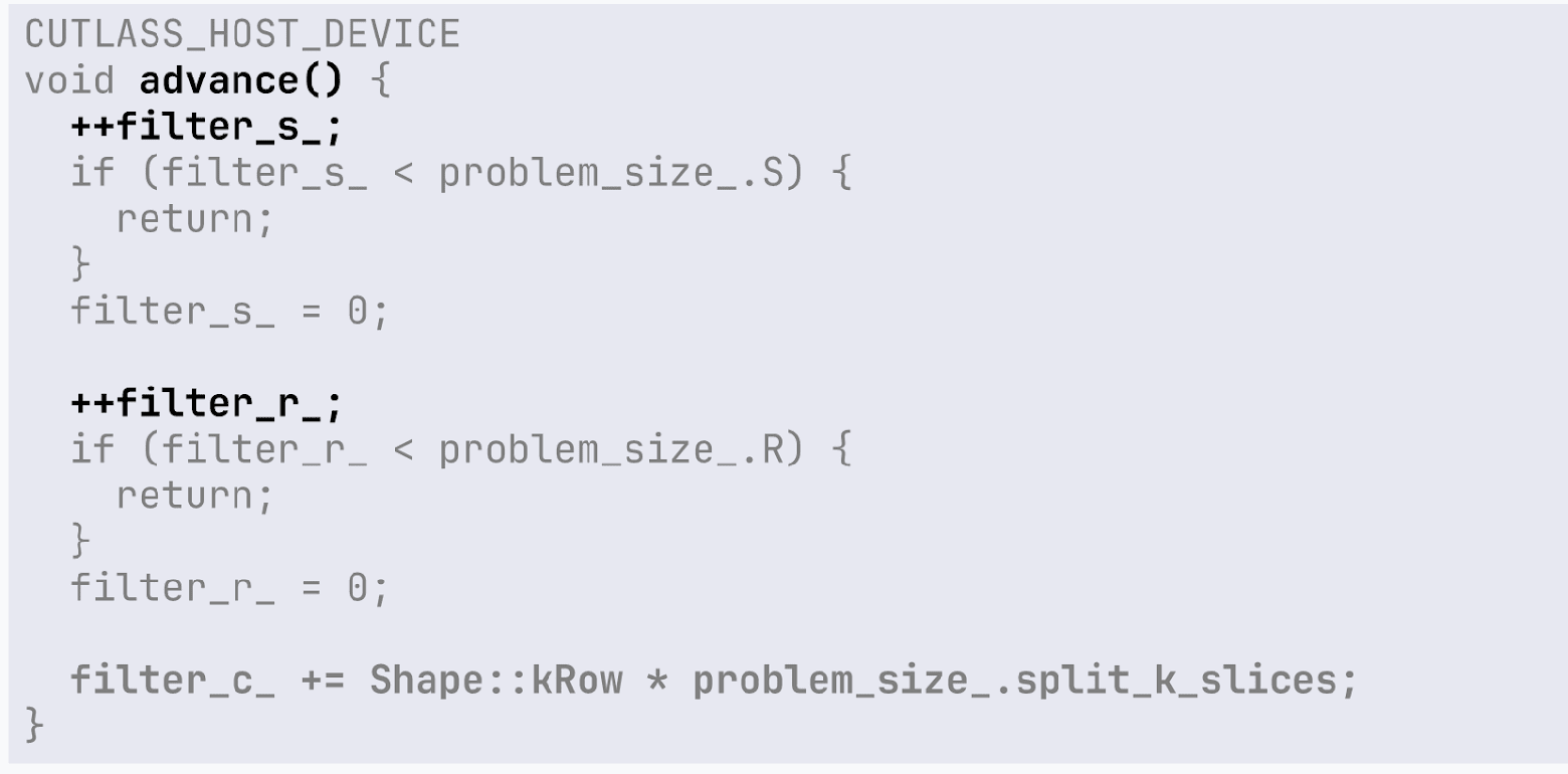 Используя координаты фильтра filter_r и filter_s (они изначально равны нулю и будут инкрементироватся) и наши значения stride, padding и так далее, получаем линейный индекс, координаты в изображении [h,w,c]. Смещение в рамках этих итераторов производится достаточно просто: инкрементом нужных нам индексов по фильтру и следующим элементам. Вот пример реализации смещения по фильтру: