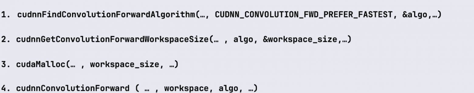 Поэтому следующая операция после подбора алгоритма в данном случае — определение количества дополнительной памяти. Это делается тоже через API cuDNN, через получение workspace_size, после чего мы его аллоцируем и используем уже при вызове соответствующей свертки. Размер памяти будет зависеть от размеров входных данных, фильтра, параметров: stride, padding, dilation.