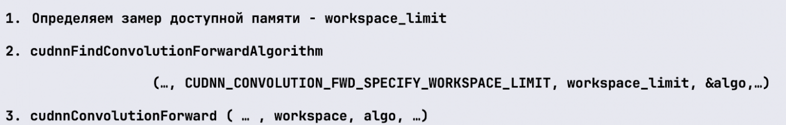 Второй подход работает противоположно. То есть мы можем указать, сколько у нас есть доступной памяти, и попросить cuDNN выбрать алгоритм, который впишется в ограничения.