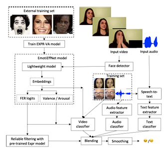 Исследователи Сбера предложили решение по распознаванию эмоций, опирающееся на три элемента. Учёные применили лёгкие нейросети EmotiEffNet, MobileViT и MobileFaceNet. Эти сети обучены на открытых наборах фото с выражениями лиц. EmotiEffNet, MobileViT и MobileFaceNet позволяют распознавать мимику в реальном времени даже на смартфонах. Дополнительно применяется фильтрация кадров. Система выбирает те, где эмоции видны чётче. Также используется объединение данных из текста, аудио и видео. Метод «позднего слияния» помогает модели быстрее подстраиваться под новые задачи.