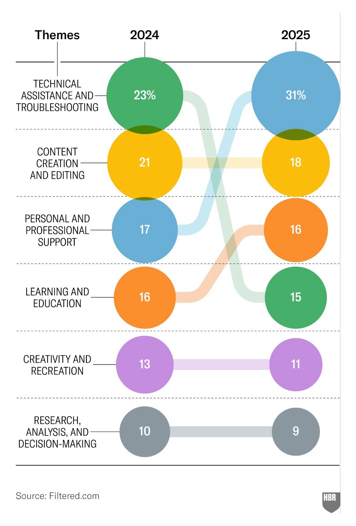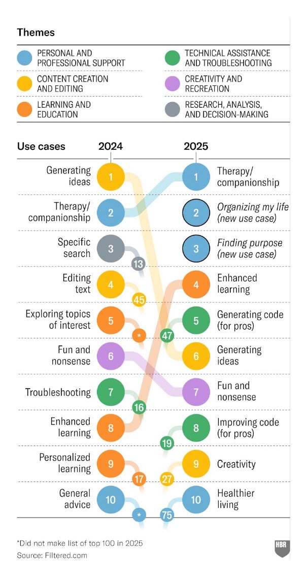 Новый лидер среди сценариев использования — терапия (подробности ниже). Ещё два новых участника в топ-5: «Организация жизни» и «Поиск смысла». Эти три примера отражают стремление к самоактуализации, что является сдвигом от технических к более эмоциональным сценариям применения за прошедший год.