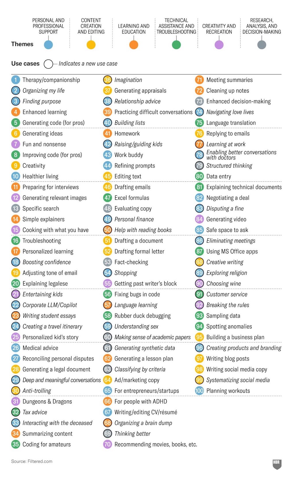 В топ-100 примеров использования генеративного ИИ появилось 38 новых позиций. Это подтверждает, что изменения продолжаются, и их очень много. Вот топ-10 примеров применения: