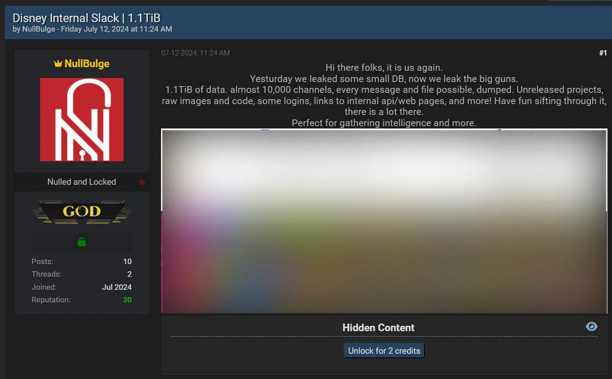NullBuldge получил доступ к 1Password, который ван Андел использовал для хранения всех паролей. Крамер пять месяцев следил за деятельностью сотрудника Disney, а в июле 2024 года опубликовал архив внутренних данных компании, включая переписку сотрудников, программный код и сведения о невыпущенных проектах.