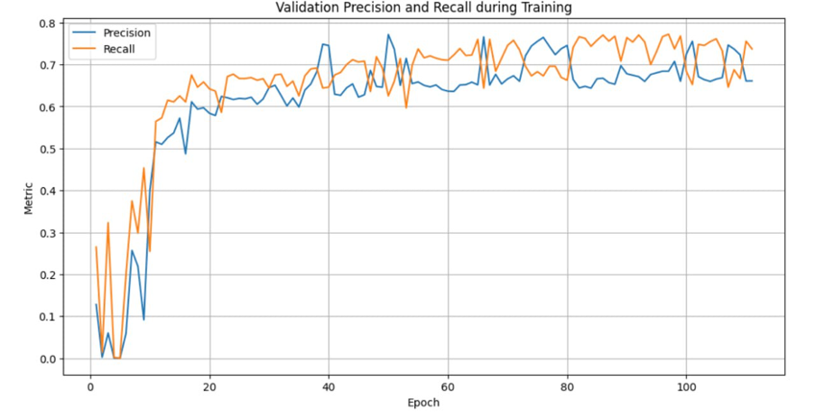 На рисунке 3 показаны изменения метрик precision и recall на тестовой выборке во время обучения. В начальной фазе обучения наблюдается активный рост обеих метрик, что отражает быстрое освоение моделью базовых признаков рунических символов.