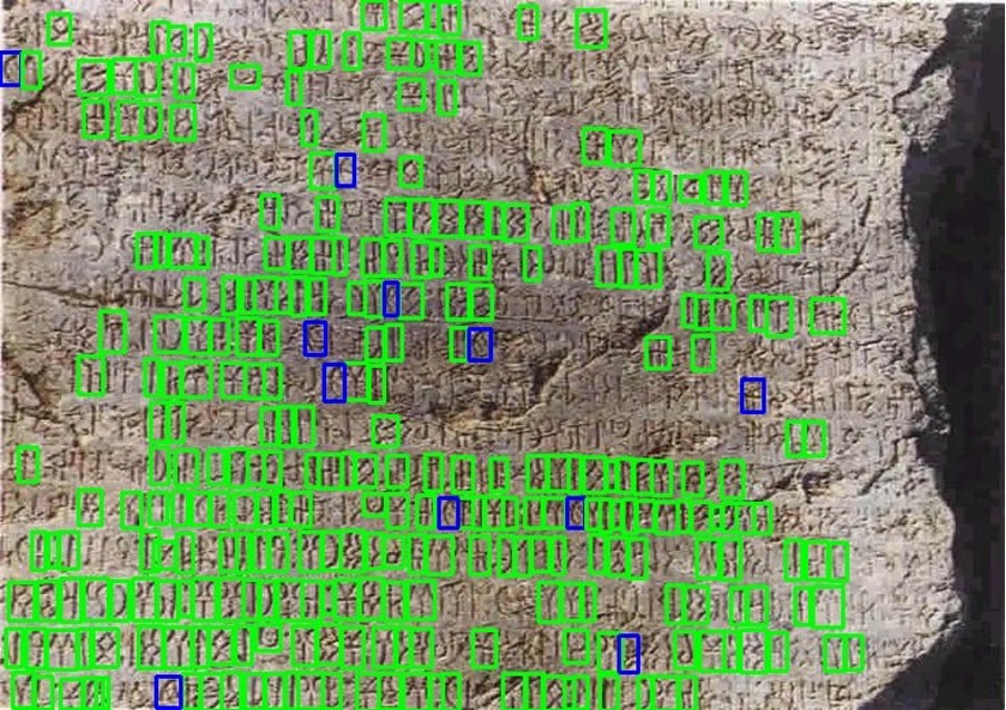 На тестовой выборке мы получили следующую точность модели детекции: precision=0.75, recall=0.801, mAP@0.5=0.825. Результаты ее применения для фотографий разных типов представлены на рисунке 5. Продемонстрированный пример и значения метрик свидетельствуют о том, что большинство рун обнаруживаются корректно. Модель “видит” более 80% всех истинных объектов на изображениях с порогом уверенности 0.6. Разметка цветной фотографии была неполной, были размечены 223 руны, а модель смогла определить 300 символов . Экспериментируя с этой фотографией мы поняли, что порог можно понижать: модель продолжает обнаруживать новые символы, не делая значительных ошибок. Символы, которые были обнаружены при снижении порога до 0.4, выделены синим цветом.