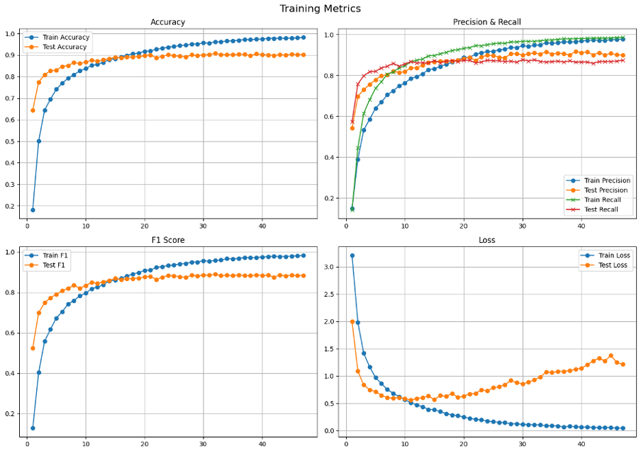 Анализ кривых обучения (рис. 7) показывает высокое качество классификации рунических символов.Классификатор успешно обучается на ограниченном наборе данных, демонстрируя высокие значения точности (около 90%) и F1-меры как на тренировочной, так и на тестовой выборках. Из этого следует, что модель способна извлекать релевантные визуальные признаки, несмотря на вариативность изображений. После примерно 10-й эпохи наблюдается переобучение классификатора – тестовая ошибка начинает увеличиваться, несмотря на снижение обучающей. Скорее всего, это происходит из-за небольшого размера обучающей выборки. На тестовой выборке полнота стабилизируется на более низком уровне, чем точность, что может свидетельствовать о склонности модели пропускать редкие или атипичные классы, включая класс неизвестных рун. После 30-й эпохи большинство метрик на тестовой выборке демонстрируют стабилизацию, что может указывать на достижение модели пределов обучаемости при текущем объеме и качестве данных.