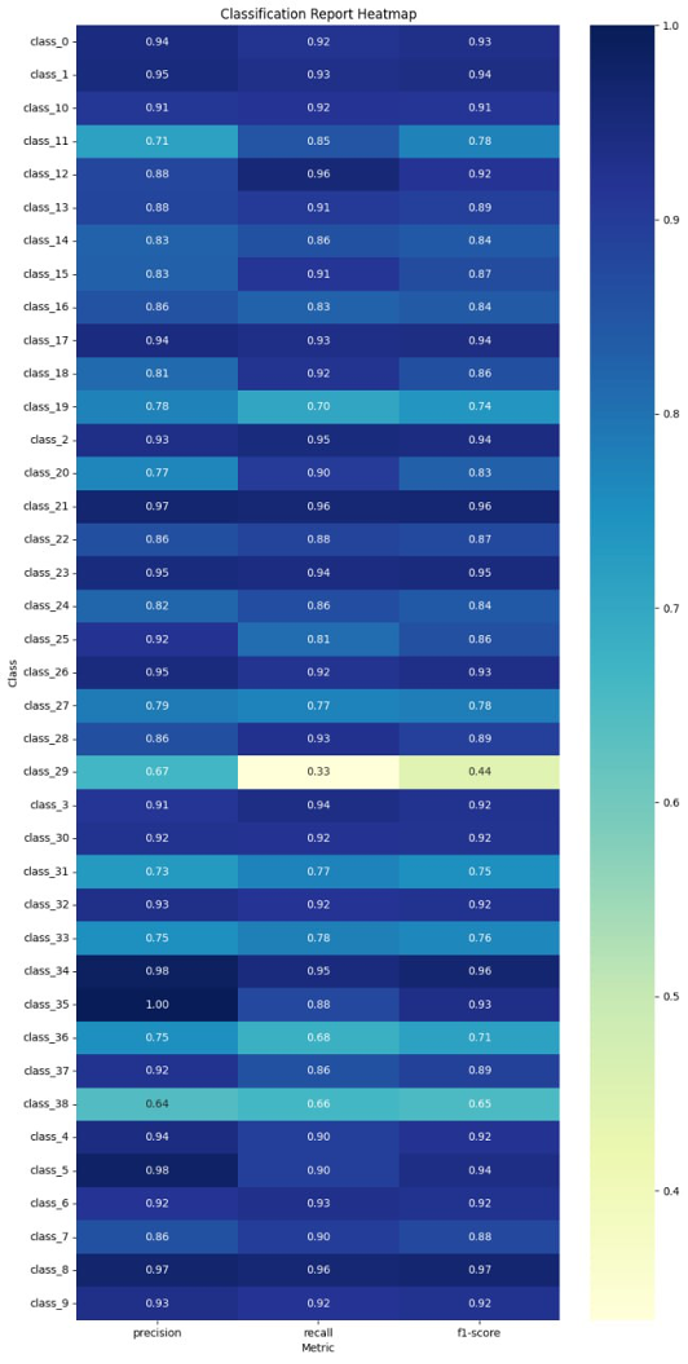 На тестовой выборке классификатор достиг следующих результатов: Accuracy=0.9023, F1=0.8840, Precision=0.8994, Recall=0.8745. Модель успешно классифицирует подавляющее большинство изображений, несмотря на разнообразие изображений (различия в освещении, фоновых шумах, стилистике начертания и др.). Около 90% предсказанных моделью символов действительно соответствуют истинным меткам, что можно назвать хорошим результатом в контексте нашей задачи. Учитывая, что на изображениях присутствуют фрагменты, визуально схожие с рунами, но не являющиеся таковыми (например орнаменты) и руны одного класса, но с разными начертаниями, значение метрики recall отражает способность модели обнаруживать максимальное количество подлинных рун. Из отчета о классификации видно, что самые низкие метрики принадлежат классам 342 (38 на рисунке) и 331 (29 на рисунке) (рис. 8). Низкое значение F1 указывает на то, что модель не может эффективно сформировать стабильное представление признаков для этих классов. Это было ожидаемо для класса 342, так как он объединяет в себе множество визуально и семантически разнородных символов, не имеющих четких общих признаков. Также, некоторые символы, отнесенные к классу неизвестной руны, могут визуально напоминать элементы из основных классов, что приводит к повышенному количеству ложноположительных и ложноотрицательных предсказаний. Плохие метрики у класса 331 объясняются нехваткой обучающих данных. Этот класс представлен в выборке меньше всех остальных, следовательно модели не хватило этих данных для извлечения признаков этого класса (рис. 6).