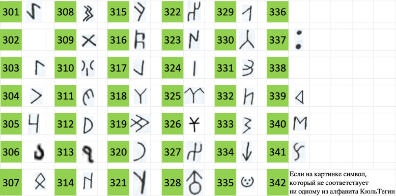 На первом этапе необходимо было сформировать цифровой алфавит из всевозможного набора символов [2–11]. В результате анализа различных источников была составлена таблица из 42 классов символов рунического алфавита, включая знаки пунктуации (рис.1). Классы 302, 336, 338 специально были оставлены пустыми, чтобы можно было добавить новые руны, не вошедшие в изначальный алфавит.