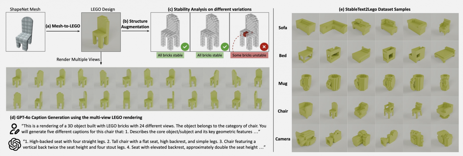 В качестве датасета использовали данные из набора ShapeNetCore. На основе каждой трёхмерной модели исследователи создали фигурки из деталей Lego в разных стилях, сохраняя общую форму. После этого модели проверили на целостность с помощью Gurobi, чтобы не было блоков, которые ни за что не держатся. На основе каждой модели создали кадры с 24 ракурсов и сгенерировали подробные описания с помощью GPT-4o от OpenAI.