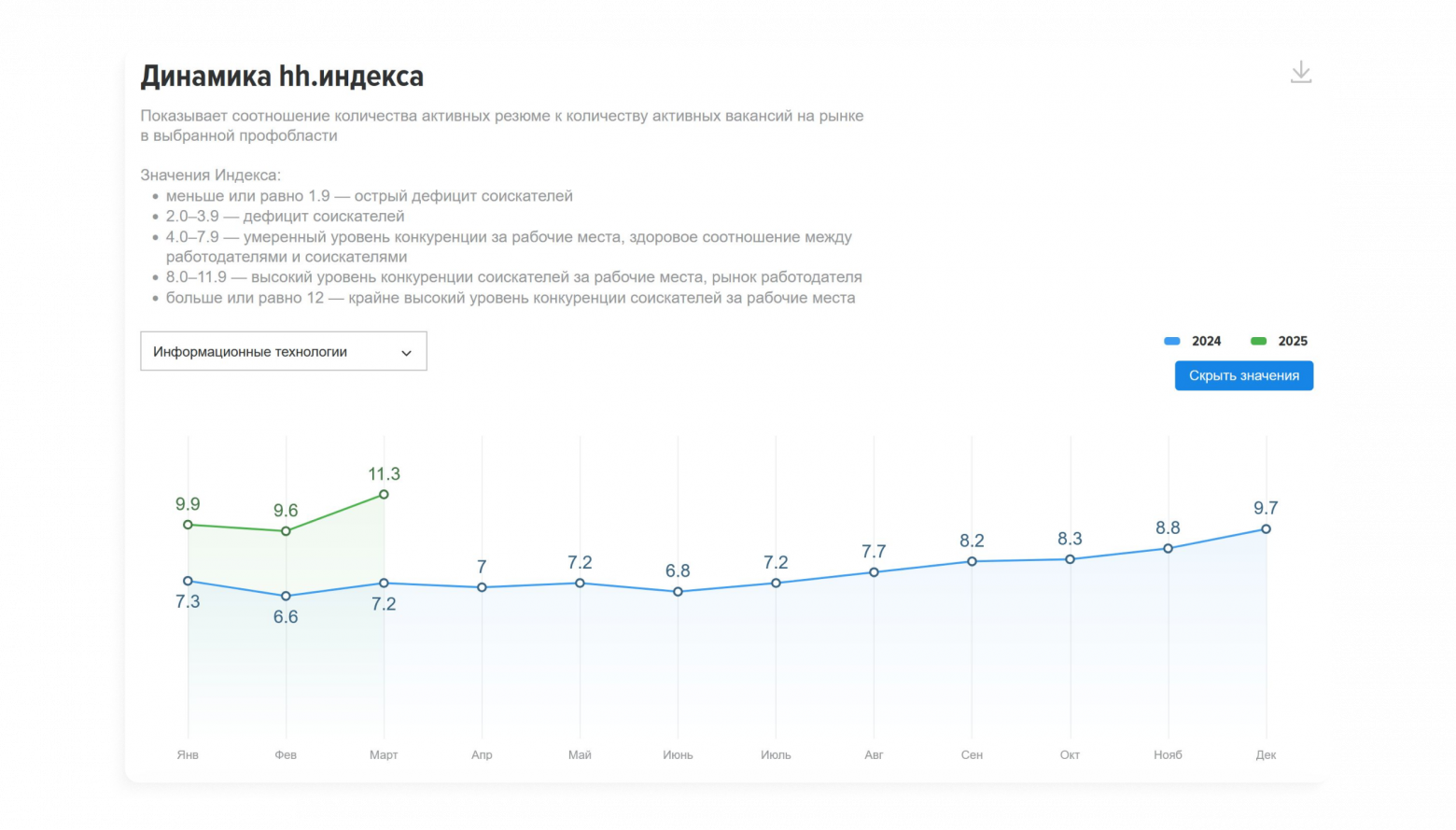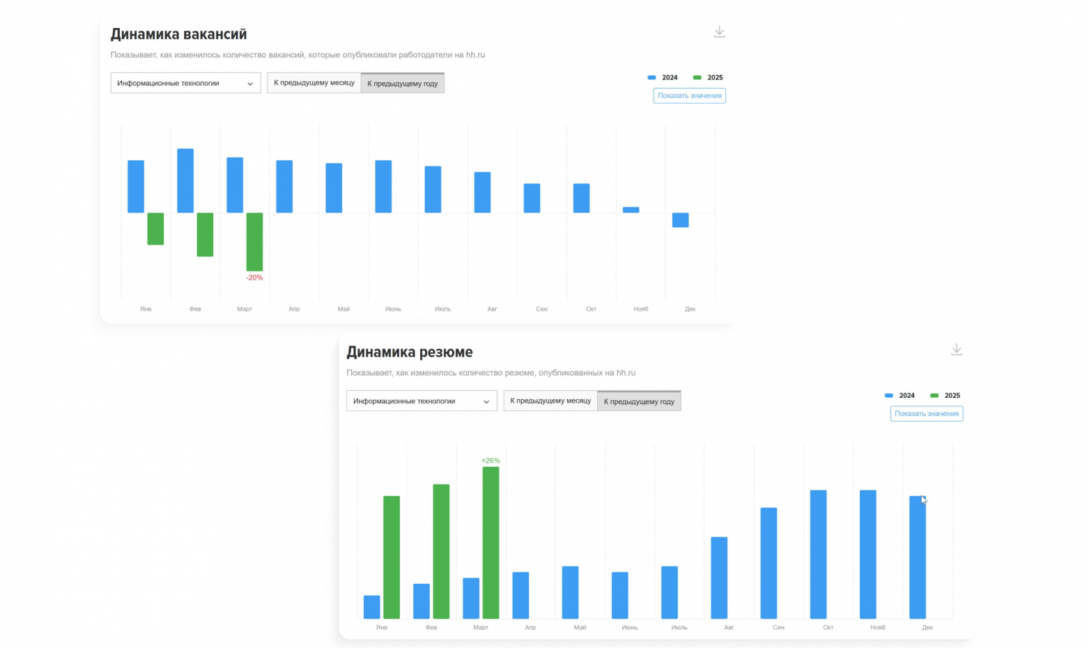 Посмотрим ещё детальнее на графики: количество вакансий к марту 2025 года упало на 20% по сравнению с предыдущим годом, а количество резюме выросло на 26%. Хабр пишет, что к концу 2024 года количество вакансий снизилось на 22% по сравнению с третьим кварталом.