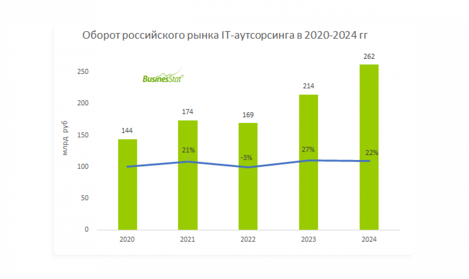Это не просто моё мнение — так говорит статистика. BusinesStat провела анализ рынка аутсорсинга в IT в 2020–2024 годах и показала, что к концу 2024-го он вырос на 49% и достиг 262 млрд руб. Для сравнения, в 2023 году цифры были на 27% ниже. Наблюдаем интересную картину: проекты на аутсорсе сокращаются, при этом запросы на него растут. Конечно, это не значит, что все компании вообще откажутся от инхаус-команд, нет. Скорее, будут продолжать искать баланс между расходами, инхаус- и аутсорс-разработчиками.