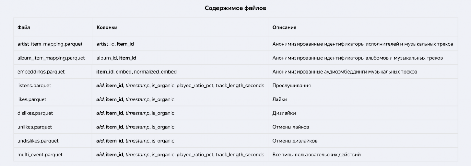 Мы выбрали Яндекс Музыку, потому что это крупнейший подписной стриминговый сервис в России, которым в среднем в месяц пользуются 28 миллионов людей. Существенная часть датасета — агрегированные прослушивания, лайки, дизлайки, а также некоторые характеристики треков, полученные из системы персональных рекомендаций «Моя волна». Все данные о пользователях и треках анонимизированы: датасет содержит исключительно числовые идентификаторы, что обеспечивает конфиденциальность.