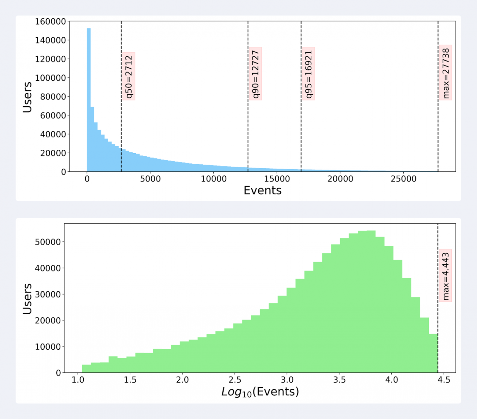 Как видно из графиков, у распределения длины пользовательской истории есть тяжёлый хвост, то есть большинство пользователей совершают относительно немного действий, а у небольшого, но весомого числа пользователей очень длинные истории. Это особенно важно учитывать при построении моделей рекомендаций, чтобы избежать переобучения на активных пользователей и не терять качество для «тяжёлого хвоста».