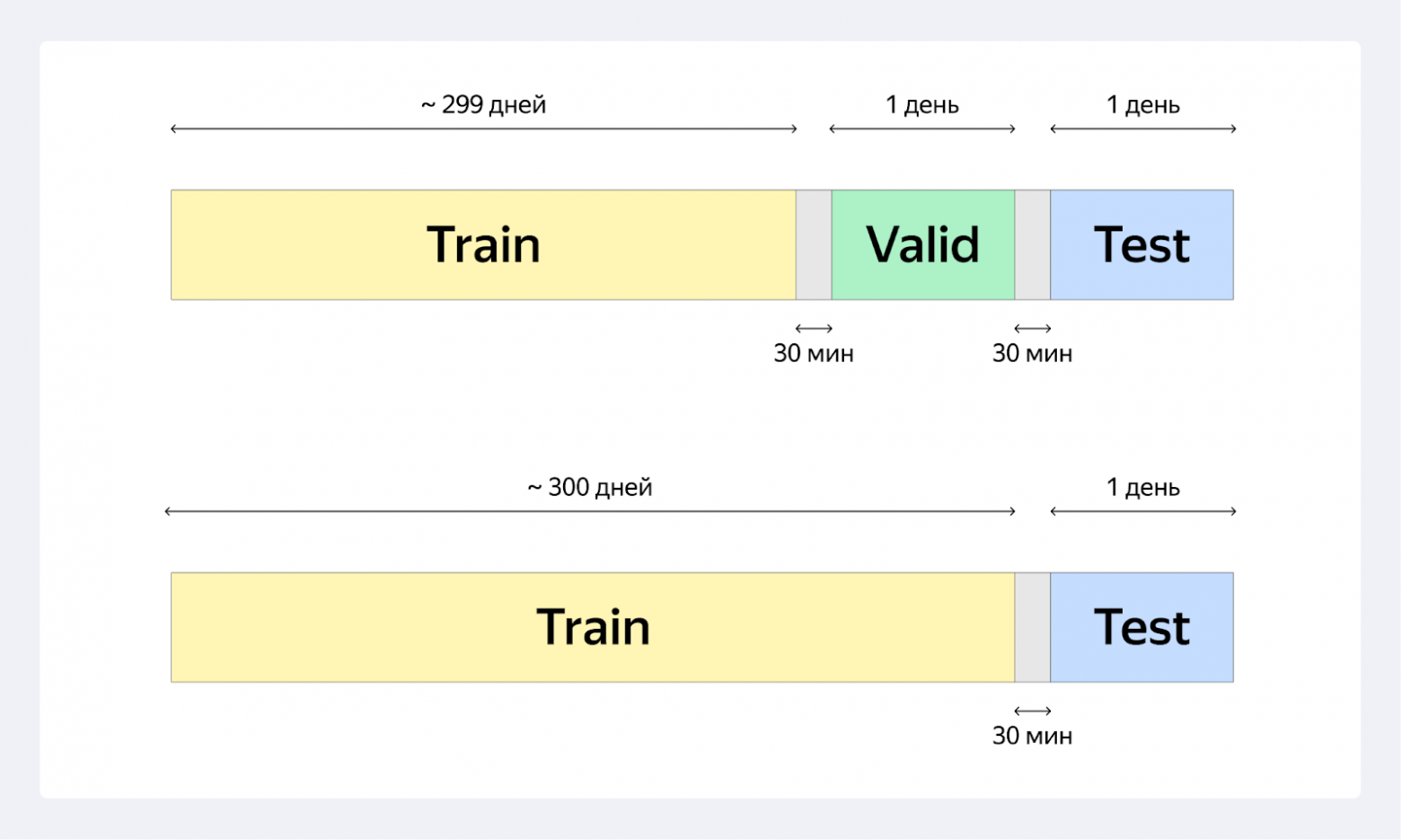 Суть метода проста: выбирается некий момент времени T, и все события после него исключаются из обучающего набора. Таким образом, модель обучается на прошлом и тестируется на будущем — как и в настоящем продакшне. Более наглядно на схеме: